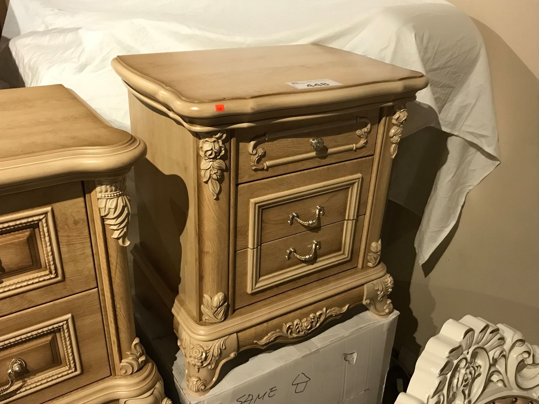 PAIR OF WHITE ORNATE WOODEN NIGHT STANDS