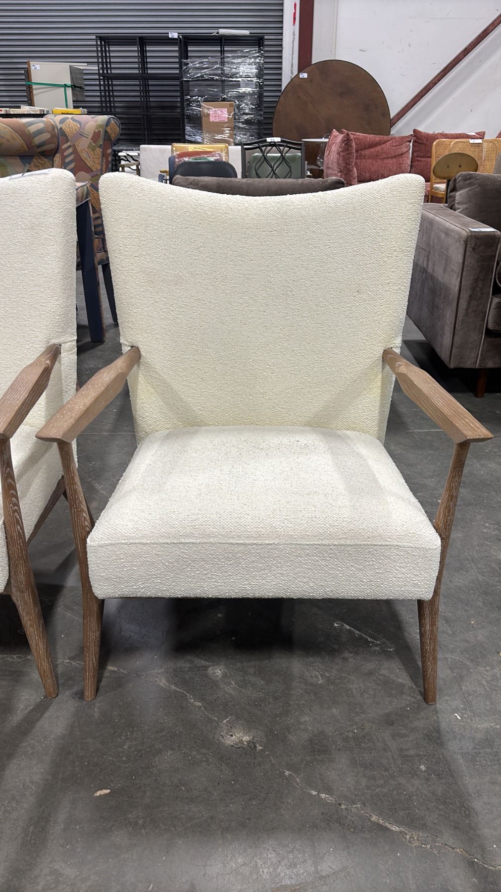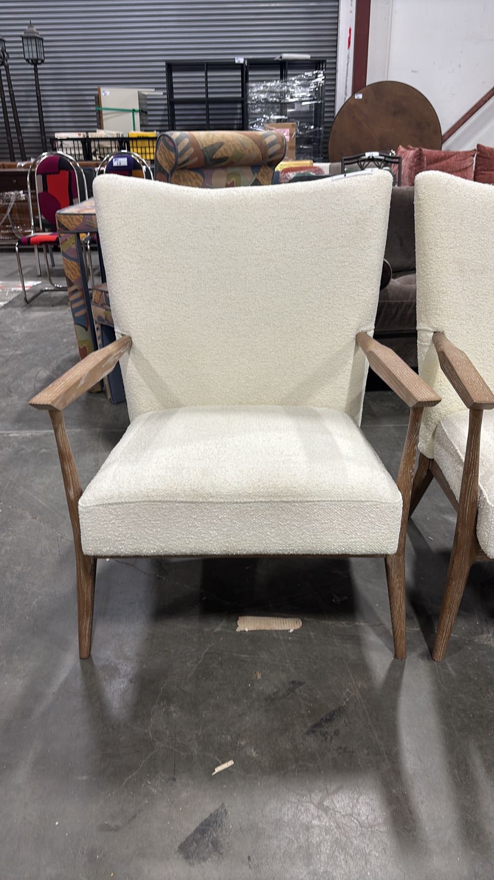 PAIR OF WHITE WING BACK ARMCHAIRS WITH WOODEN LEGS
