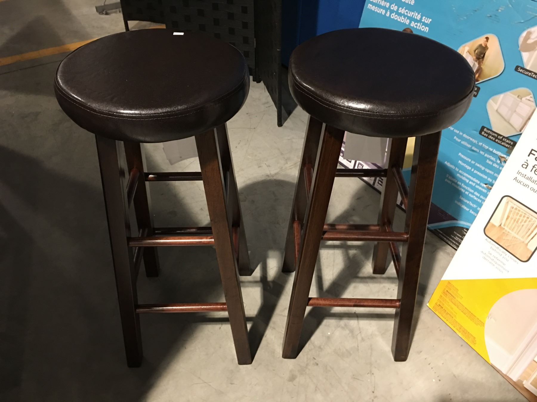 PAIR OF WOODEN BAR STOOLS WITH BROWN LEATHER UPHOLSTERED SEATS