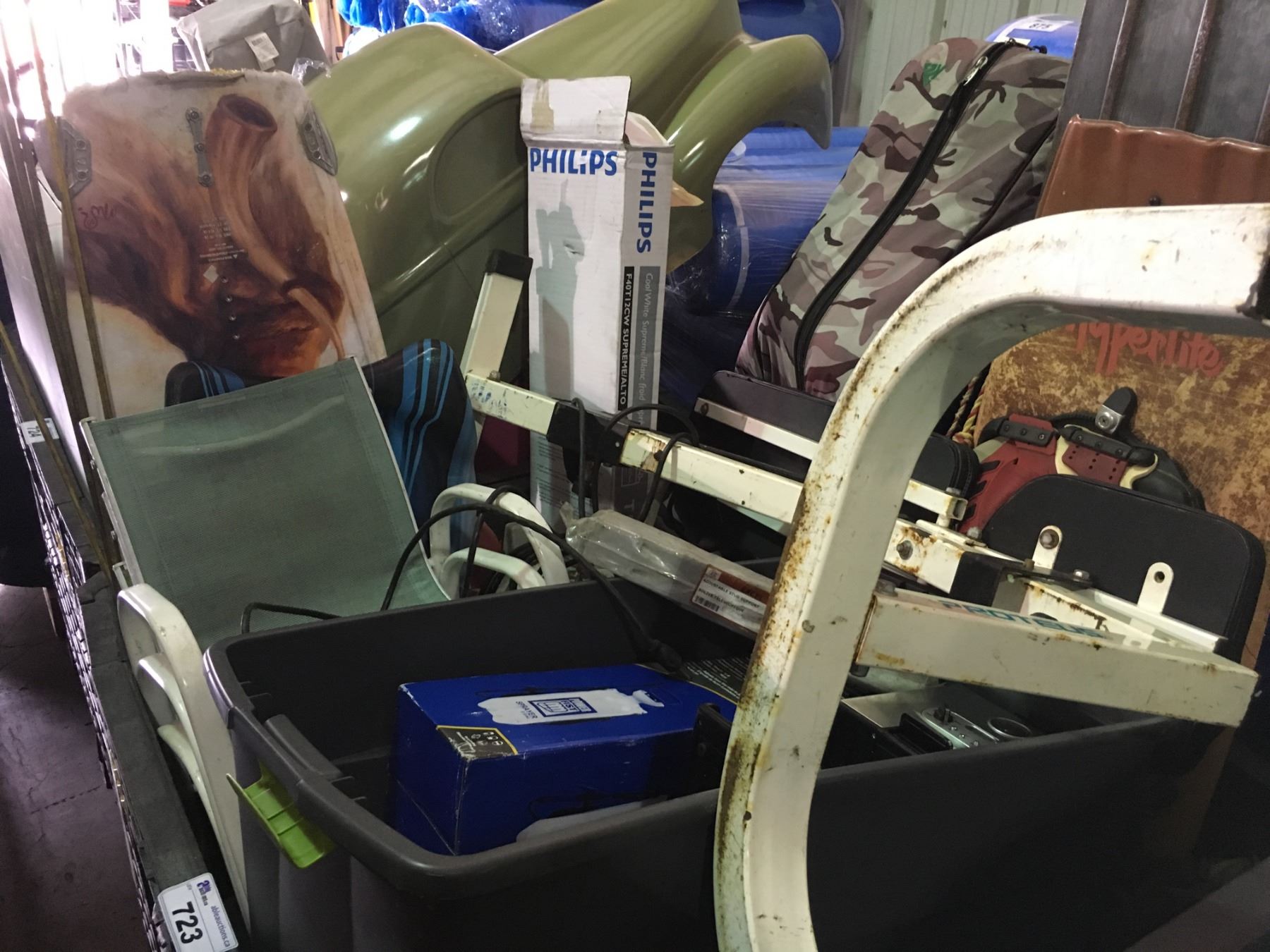 PALLET BIN OF ASSORTED HOUSEHOLD ITEMS & SKIS AND SLEDS (PALLET BIN NOT INCLUDED)