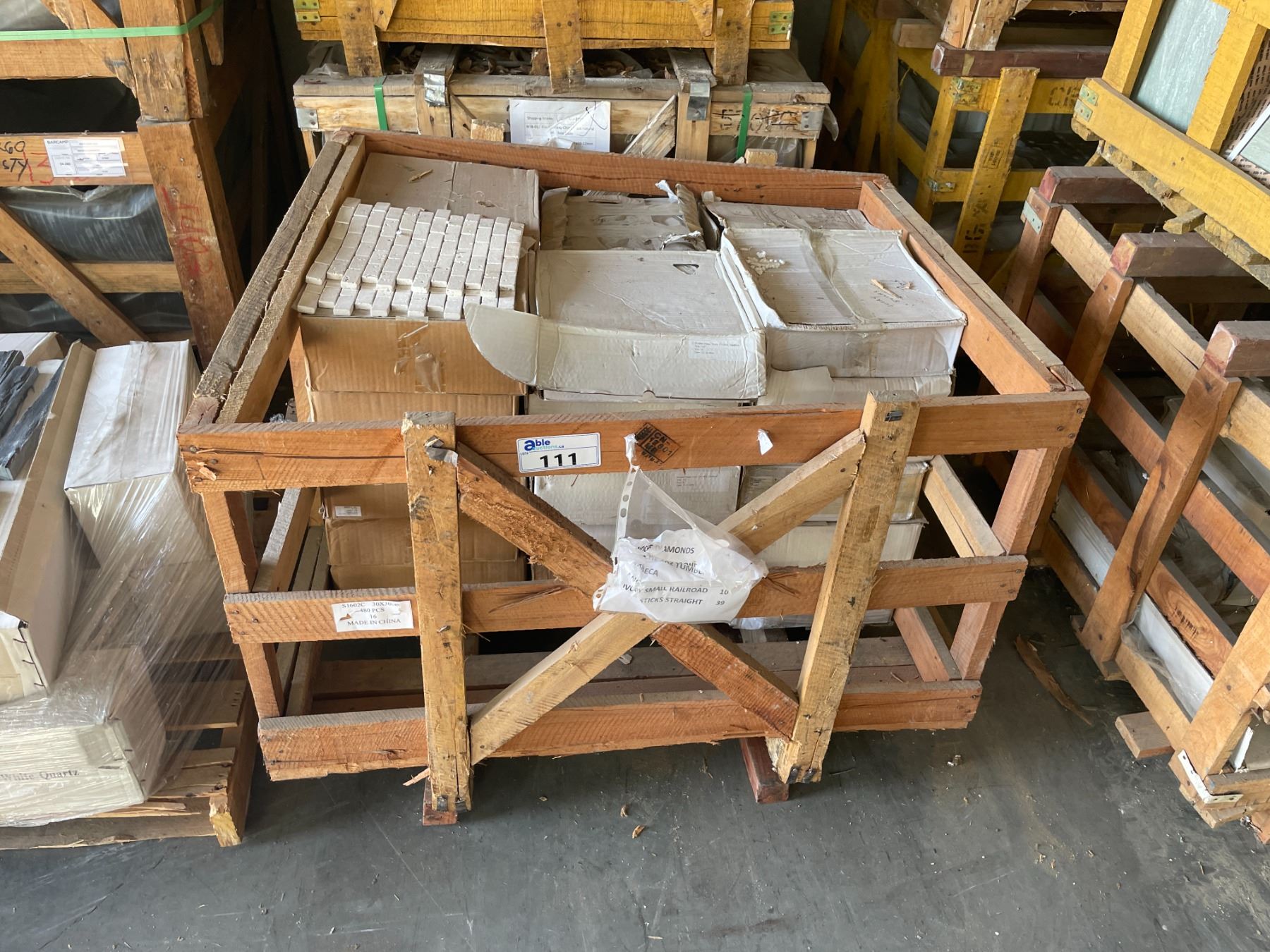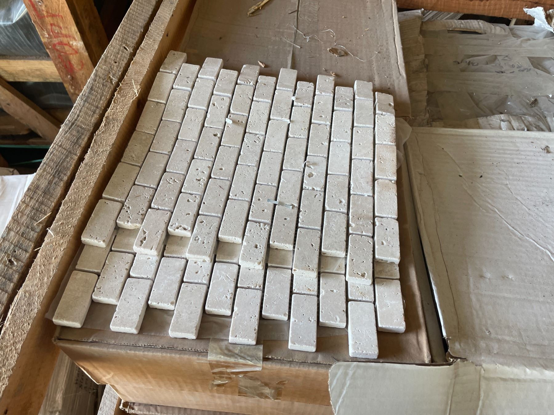PALLET CRATE OF 1 X 2 IVORY TUMBLED 12 X 12 NATURAL STONE MOSAIC SHEET TILES