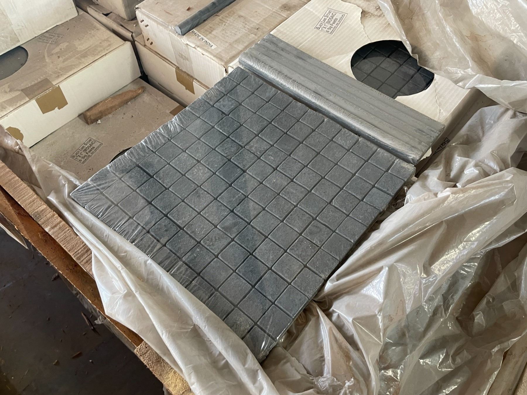 PALLET CRATE OF ASSORTED LIME BLACK 12 X 12 NATURAL STONE MOSAIC SHEET TILES & BOXES OF LIME BLACK PENCIL NATURAL STONE EDGING TILES
