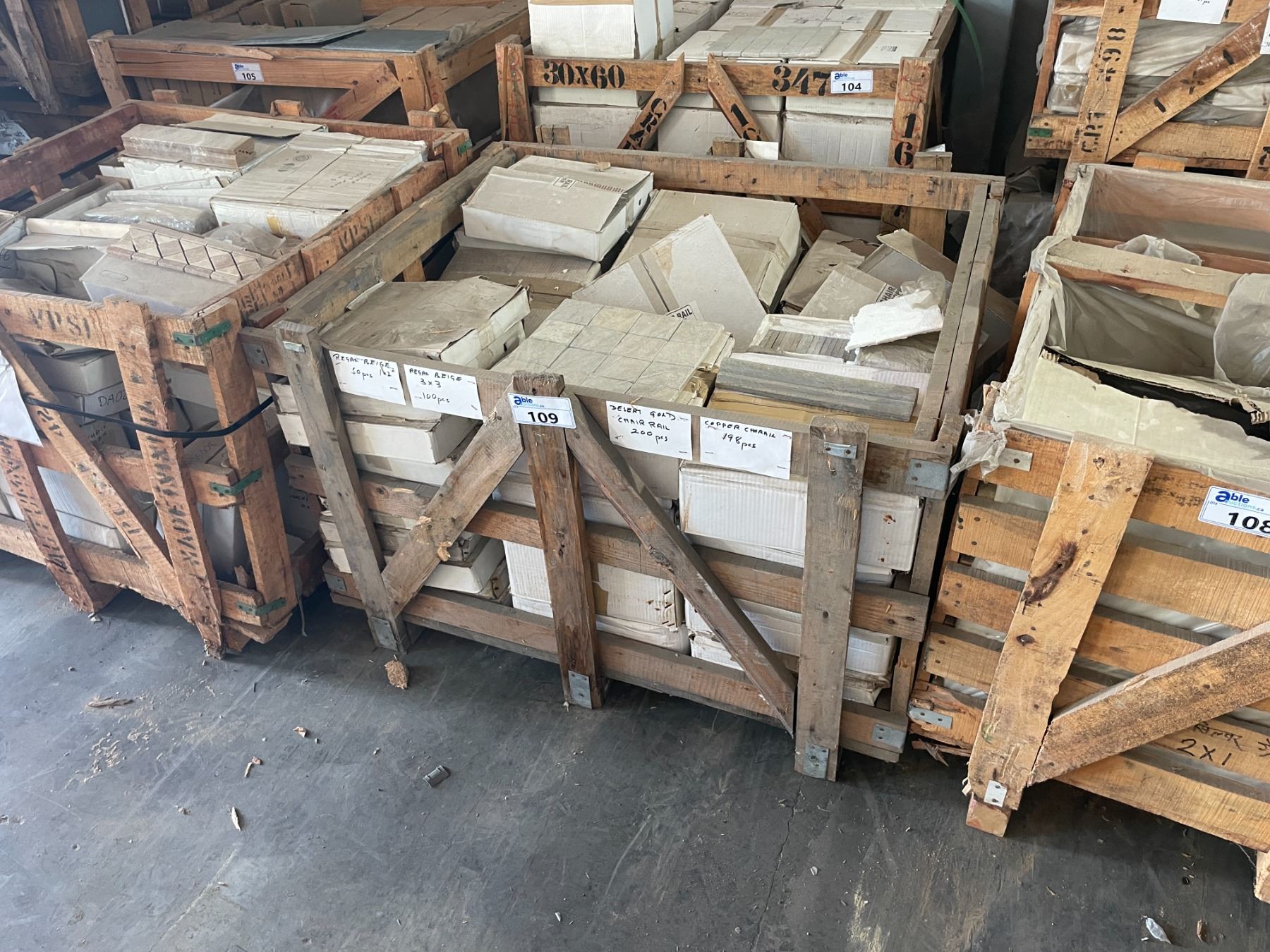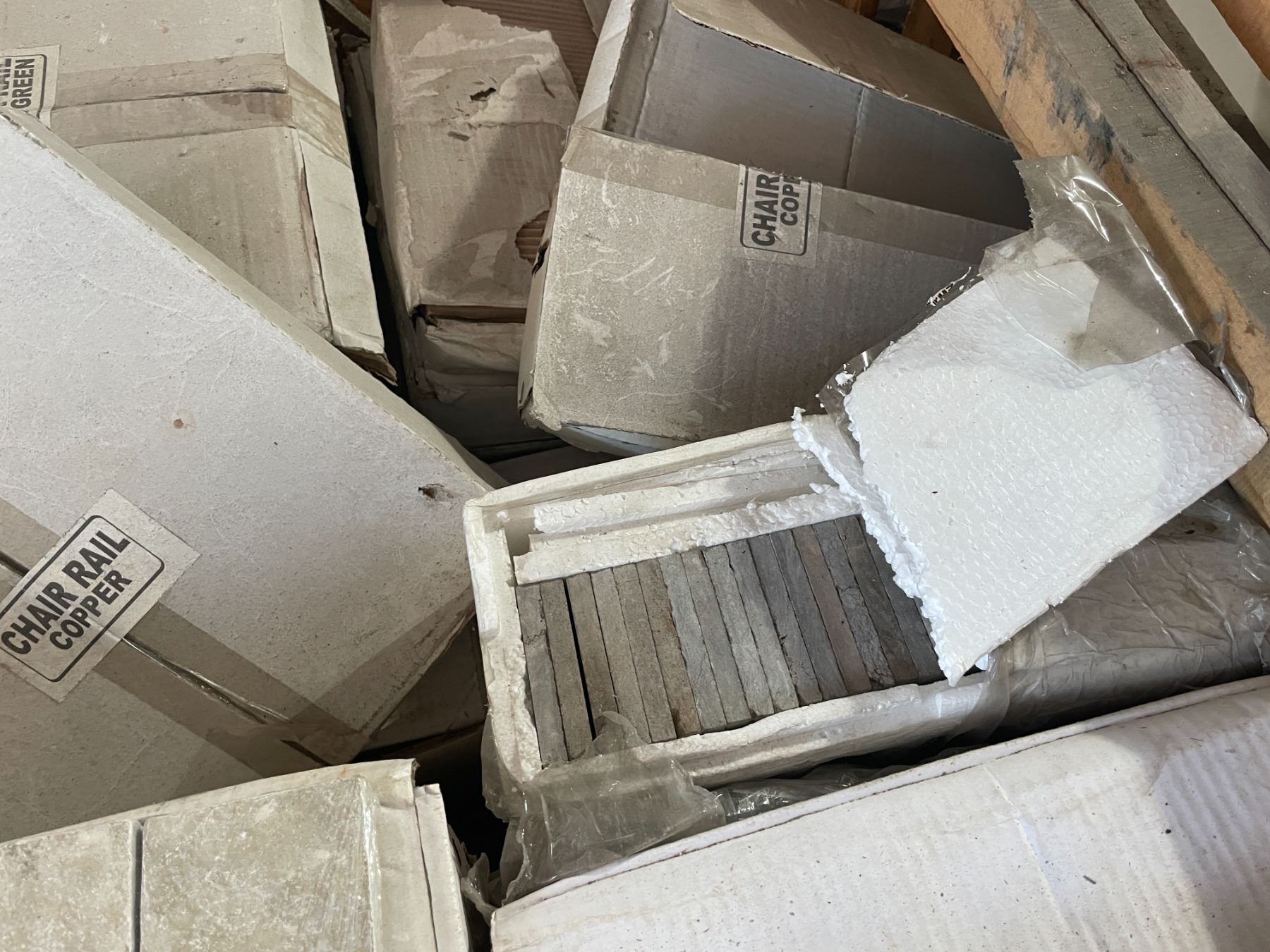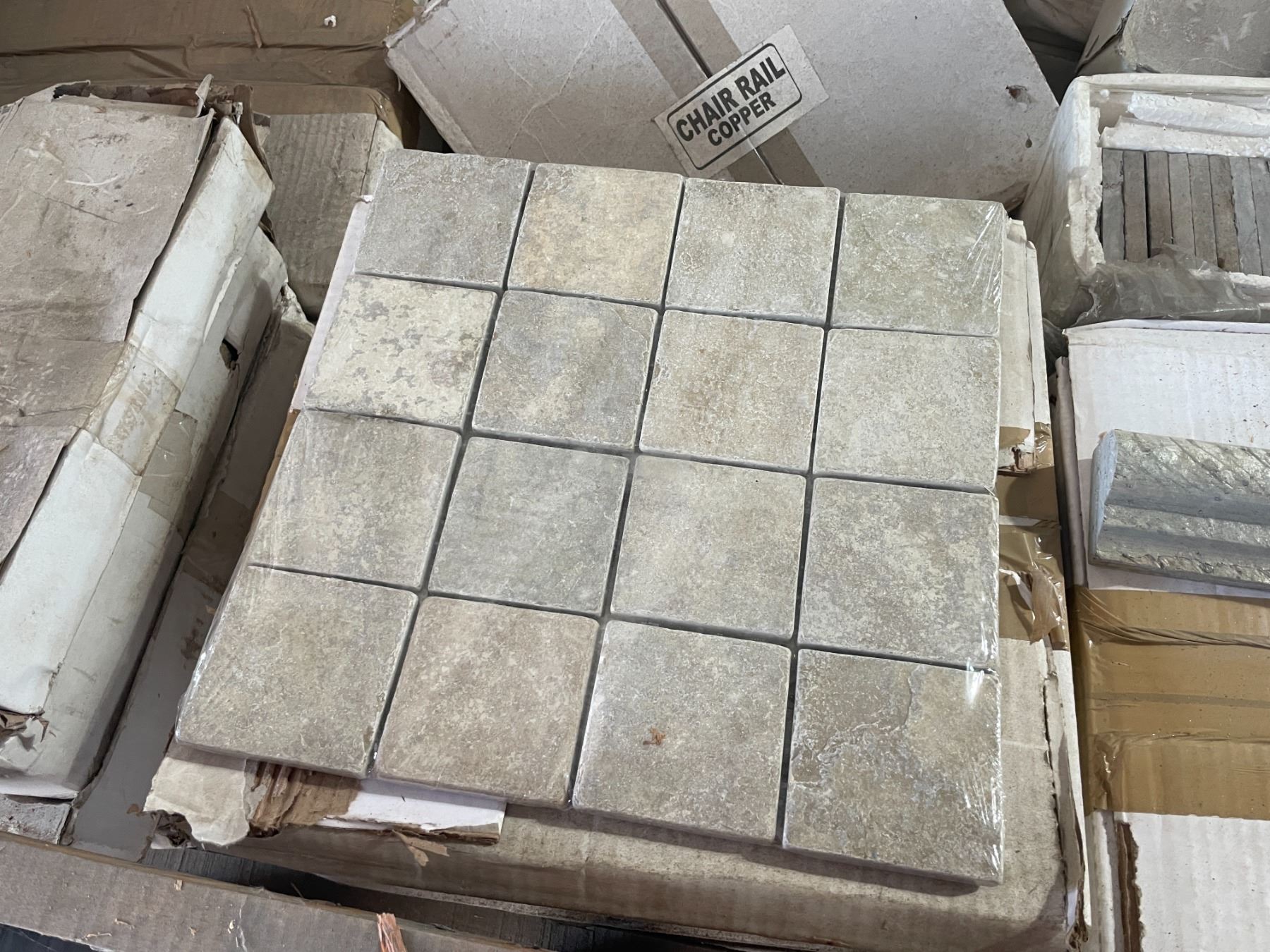 PALLET CRATE OF ASSORTED REGAL BEIGE 12 X 12 NATURAL STONE MOSAIC SHEET TILES, COPPER CHAIR RAIL TILE, & SMALL 2 X 2 TILES
