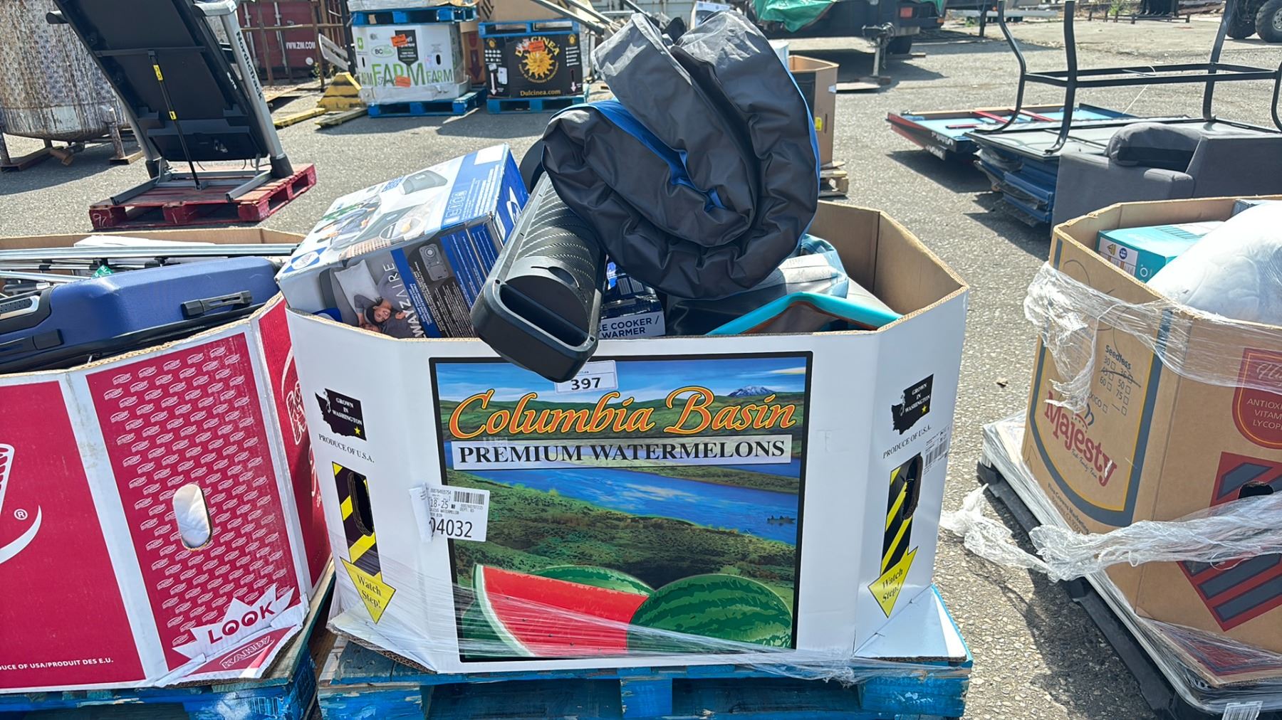 PALLET FILLED WITH - AIR MATTRESS, POPCORN MACHINE, TOWER FANS, PADDLE BOAT, POT/PANS & MORE