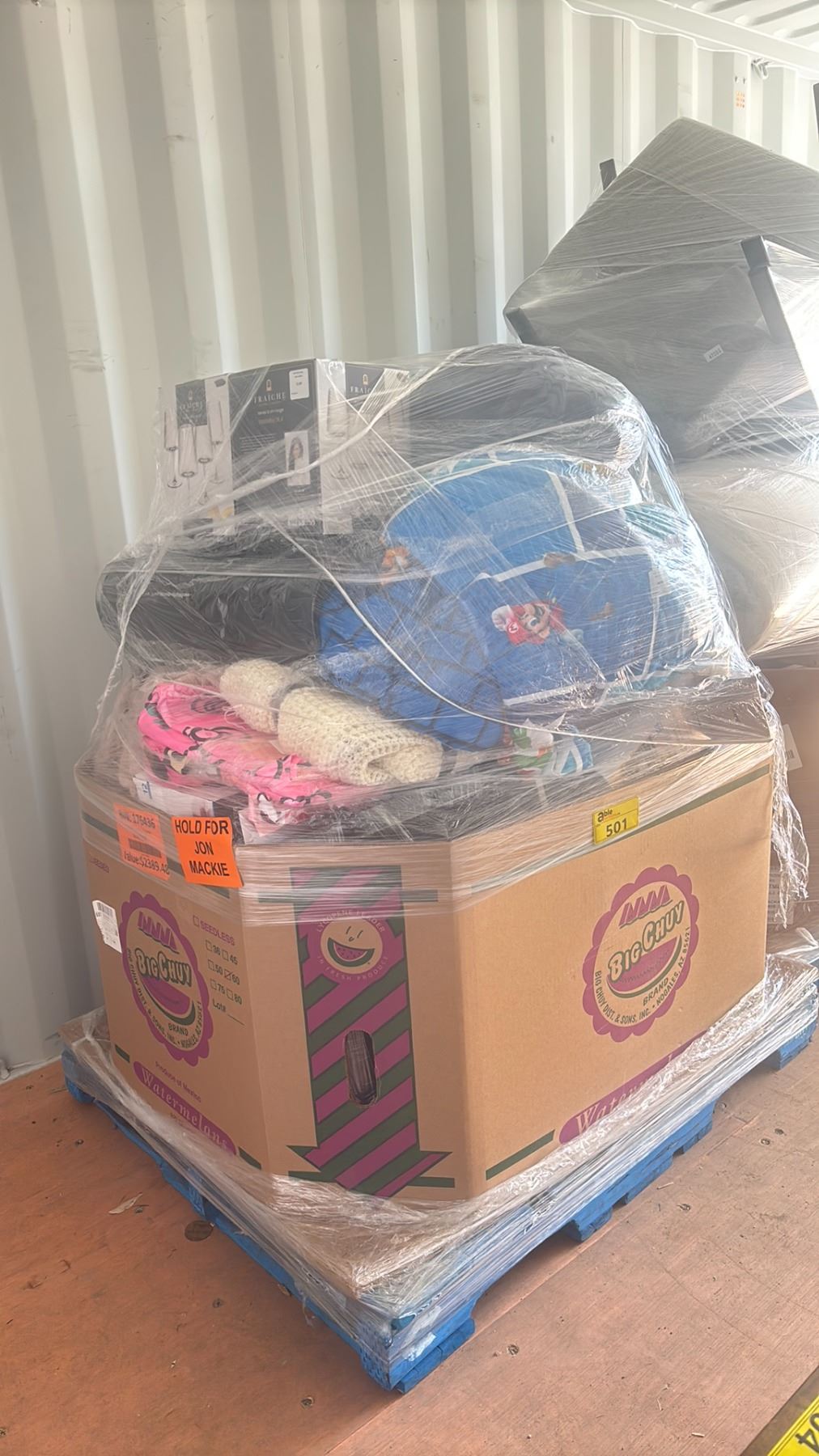 PALLET FILLED WITH - ASSORTED BEDDING, LUGGAGE, LAUNDRY BASKET, DINNERWARE SET, SHEETS & MORE *MUST TAKE ALL ON PALLET* ( LOCATED IN SHIPPING CONTAINER - FXLU 178513 1 )