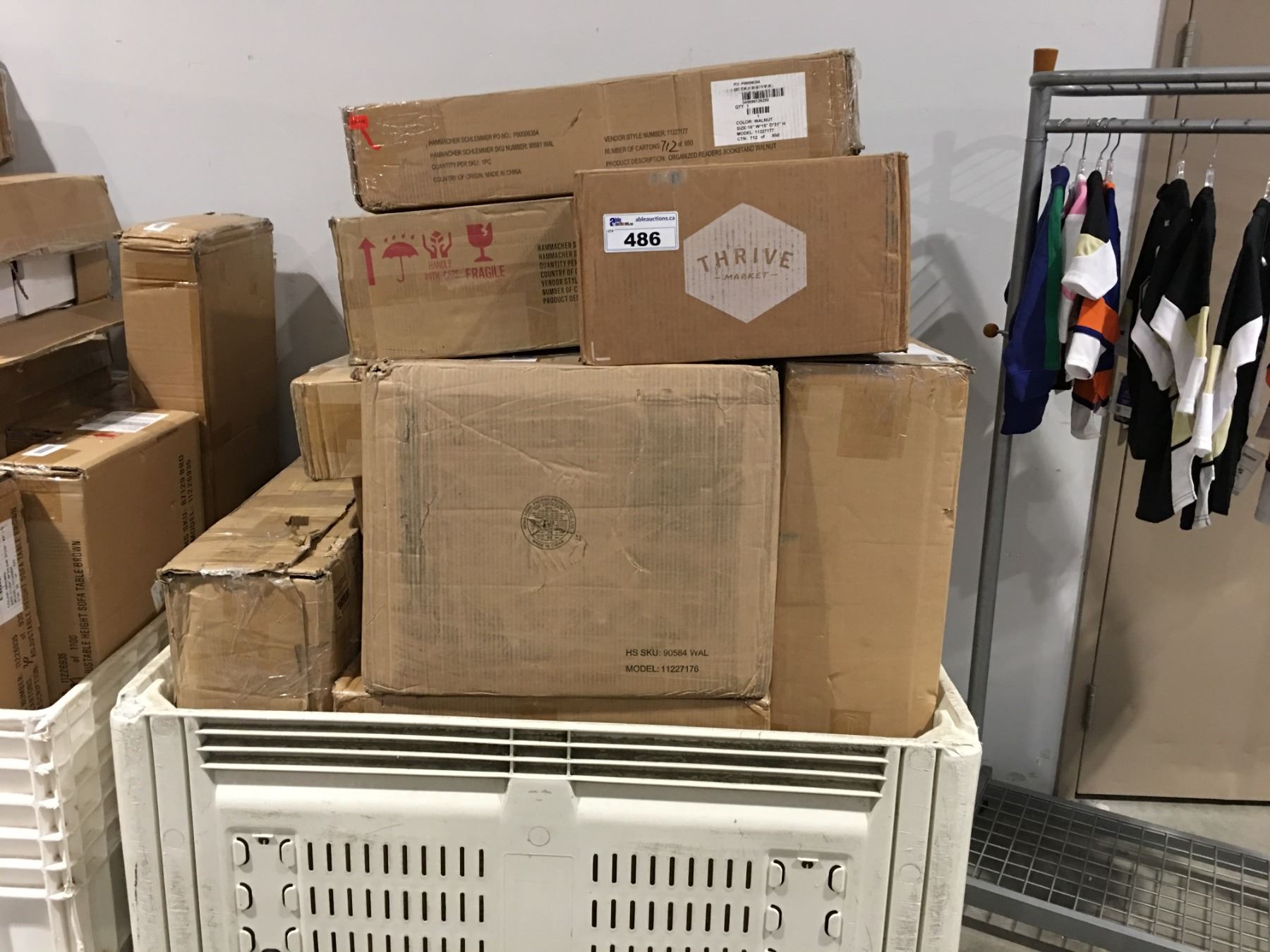 PALLET LOT NEW BOXED FURNITURE ITEMS, SOFA TABLES, END TABLES, MAGAZINE TABLES ECT (WHITE PLASTIC PALLET BIN NOT INCLUDED)