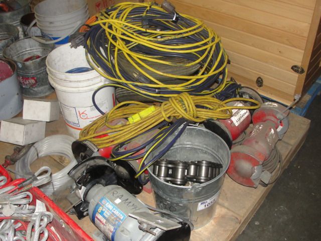 PALLET LOT OF ASSORTED BENCH GRINDERS, POWER CORDS, CONSTRUCTION HARDWARE, ETC