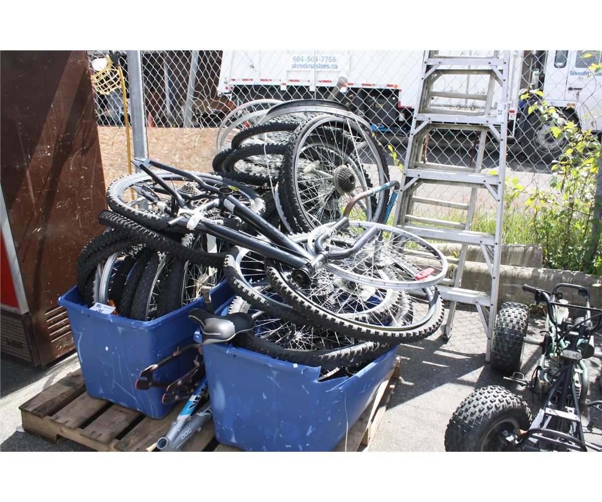 PALLET LOT OF ASSORTED BIKE PARTS; WHEELS, FRAMES, ETC