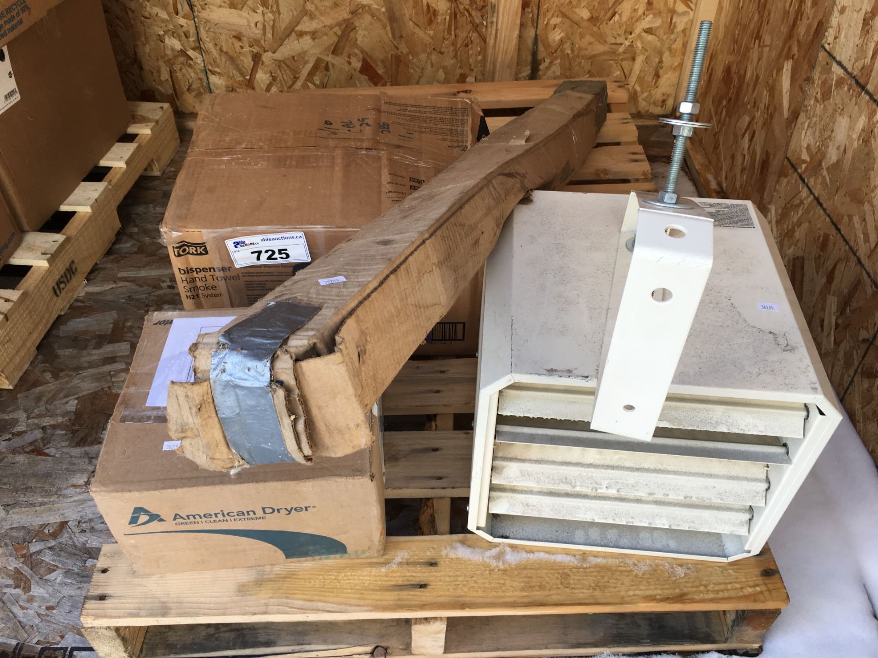 PALLET LOT OF ASSORTED COMMERCIAL BATHROOM ACCESSORIES- SOAP DISPENSER/HAND TOWEL DISPENSER/ AUTOMATIC DRIER & ELECTRIC HEATER