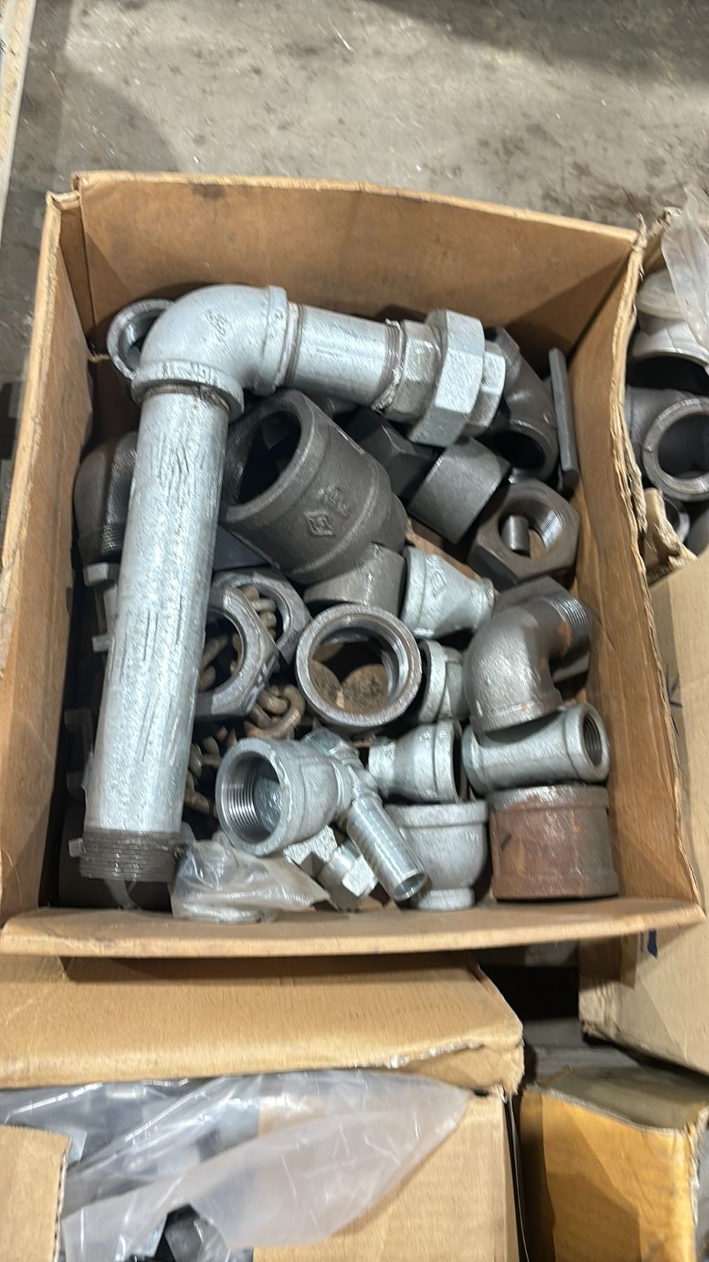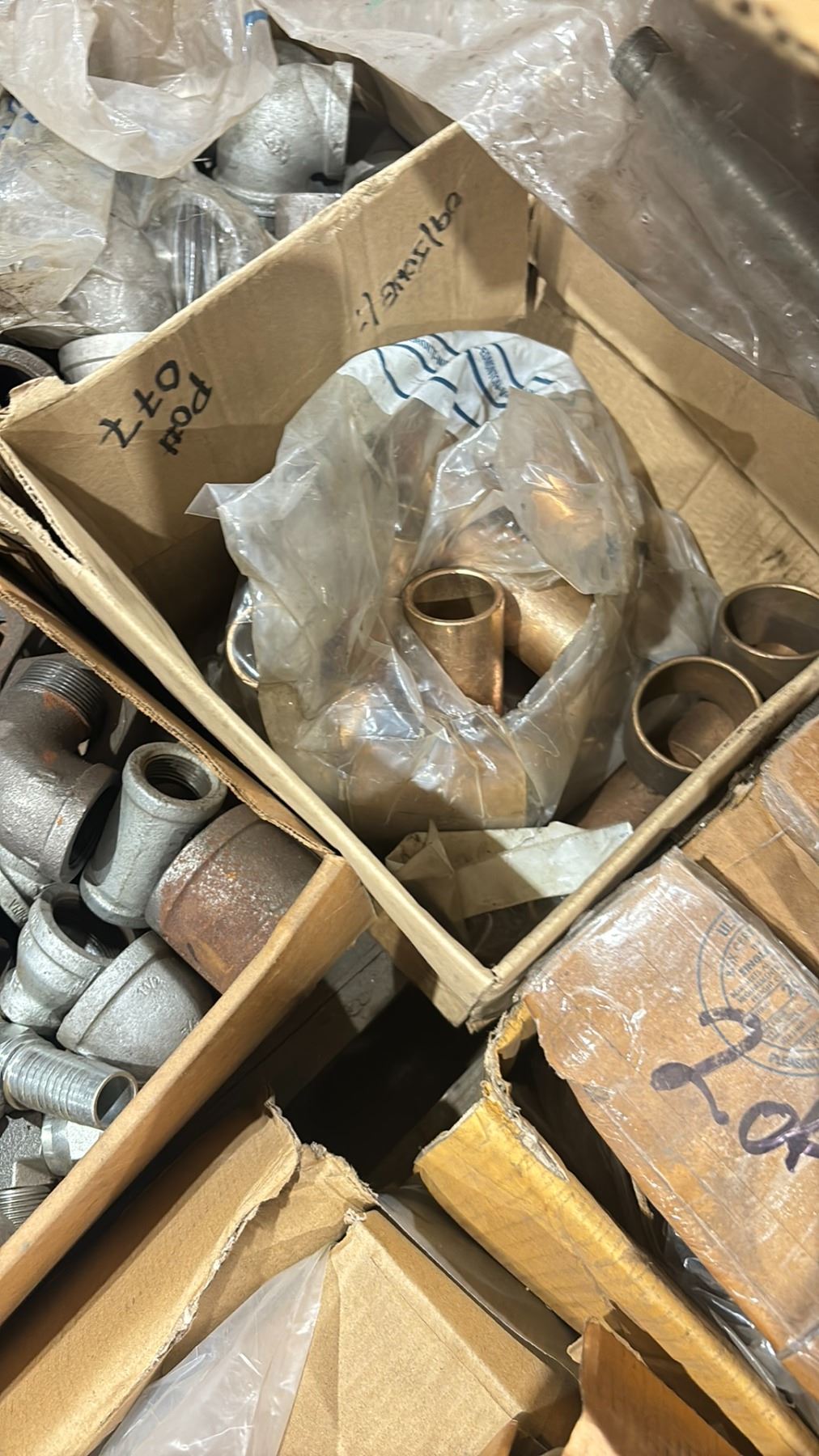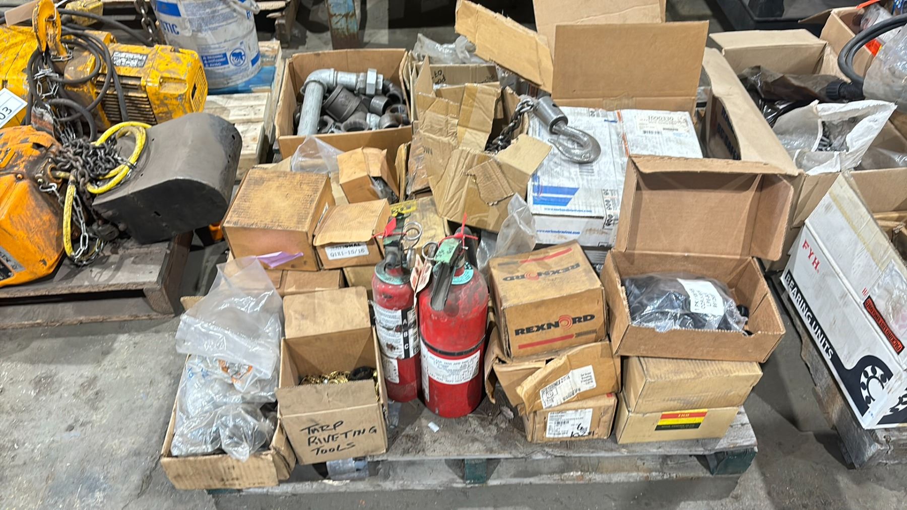 PALLET LOT OF ASSORTED MACHINE SHOP HARDWARE - FITTINGS, RATCHETING TIE DOWNS, LIFT CHAIN, CLAMP