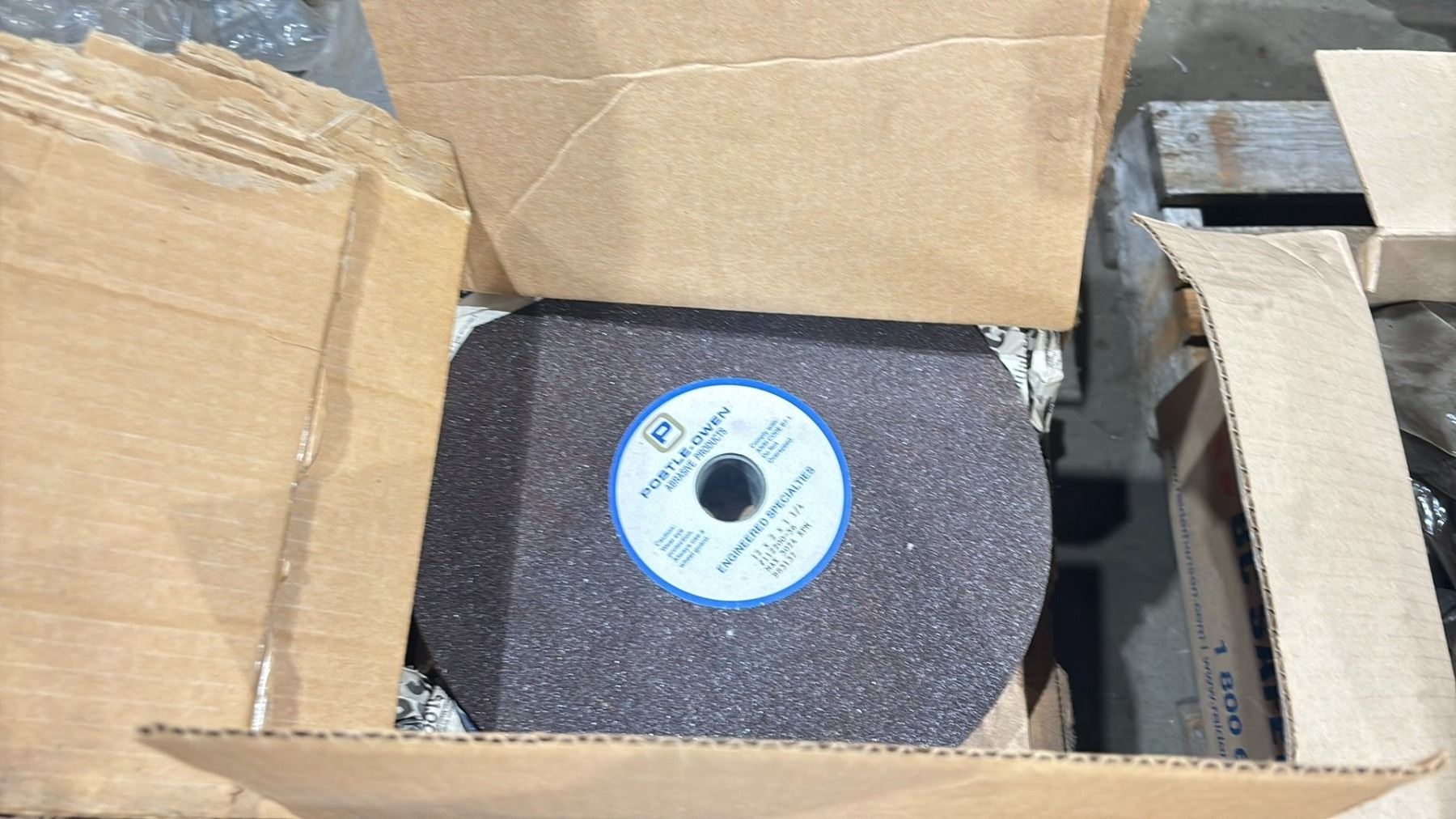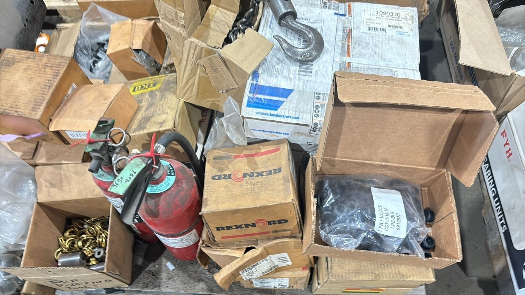 PALLET LOT OF ASSORTED MACHINE SHOP HARDWARE - FITTINGS, RATCHETING TIE DOWNS, LIFT CHAIN, CLAMP KITS, ABRASIVE GRINDING DISCS & BOLTS/ HARDWARE