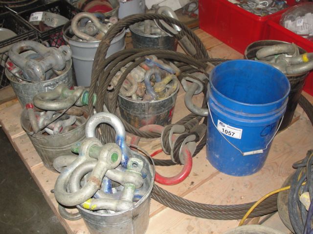 PALLET LOT OF ASSORTED SHACKLES, HEAVY CABLE LINES, ETC