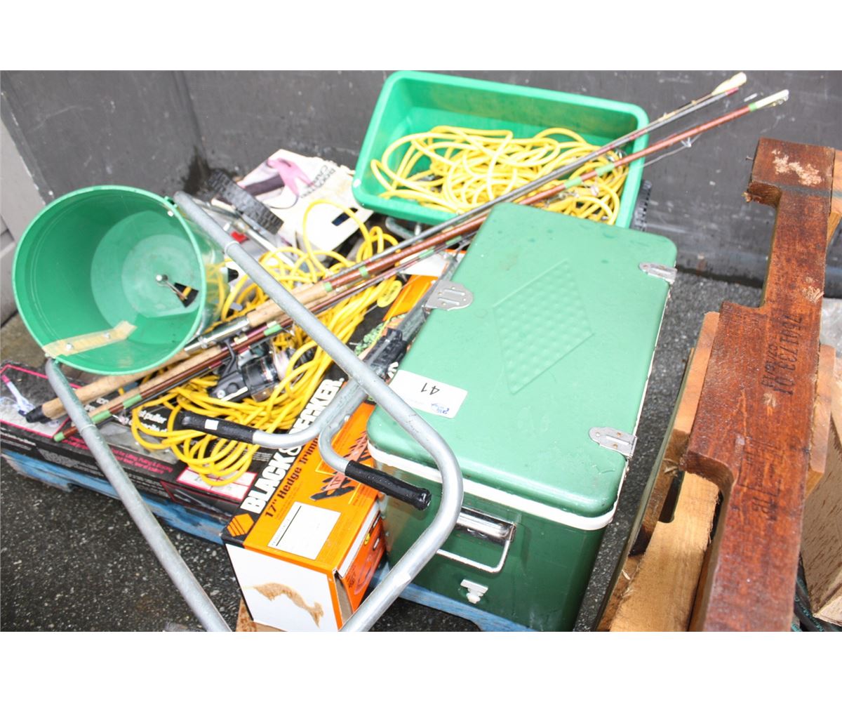 PALLET LOT OF ASSORTED TOOLS; BLACK&DECKER TRIMMER, FISHING RODS, EXTENSION CORDS, ETC