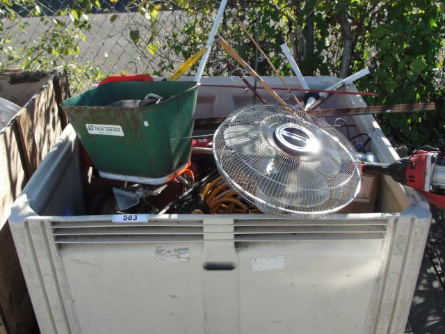 PALLET LOT OF ASSORTED TOOLS HARDWARE AND MISC ITEMS (GREY BIN NOT INCLUDED)