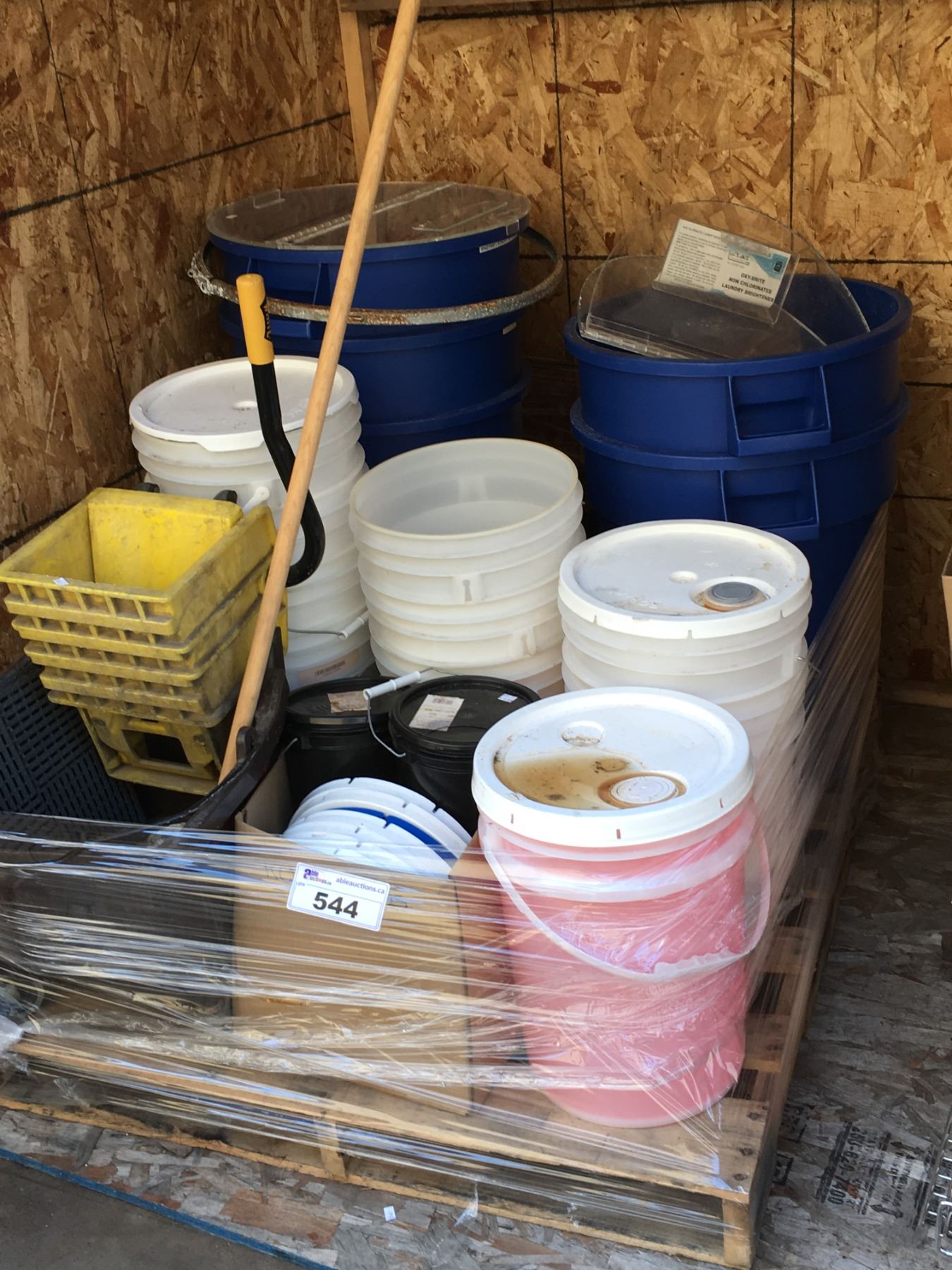 PALLET LOT OF BLUE PLASTIC GARBAGE CANS, WHITE BUCKET, LIQUID SOAP CLEANERS, DRY SOAP CLEANERS ECT.