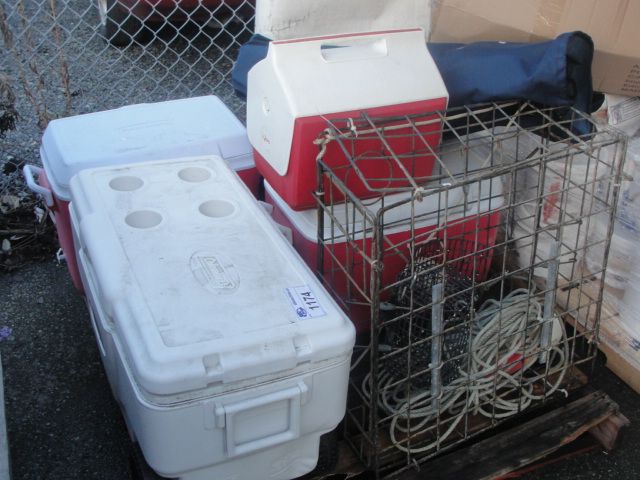 PALLET LOT OF CAMPING COOLERS, CHAIRS, CRAB TRAP ETC