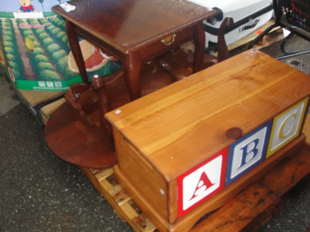 PALLET LOT OF FURNITURE; WOODEN TRUNK, 2 SMALL LIVING ROOM TABLES