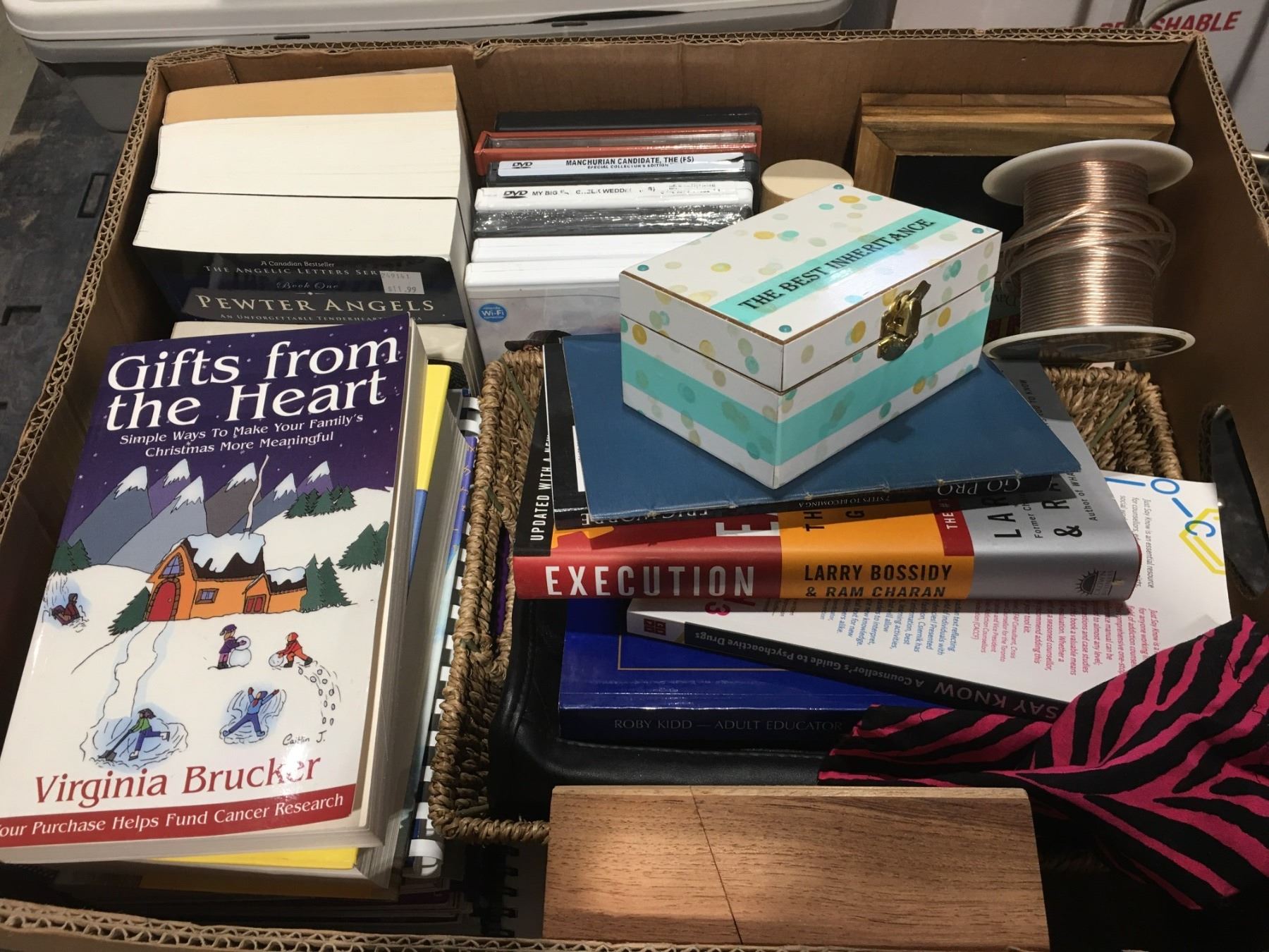 PALLET LOT OF ITEMS. PICTURE FRAMES, SUITCASE, VHS, DVD, SHOULDER HEAT PAD, REGULAR HEAT PAD, HOT MASSAGE STONES, LAMP SHADE, DECORATIONS, STOOL, TOILET PAPER HOLDER, BASKET, CRAFT SUPPLIES, OFFICE PAPER HOLDERS, RECIPE CARDS AND BOXES, TIGGER STUFFIES, PIECE OF GRANITE AND MUCH MORE