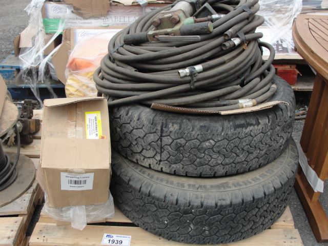 PALLET LOT OF MISC; HOSELINES, TIRES, RAIN GEAR ETC