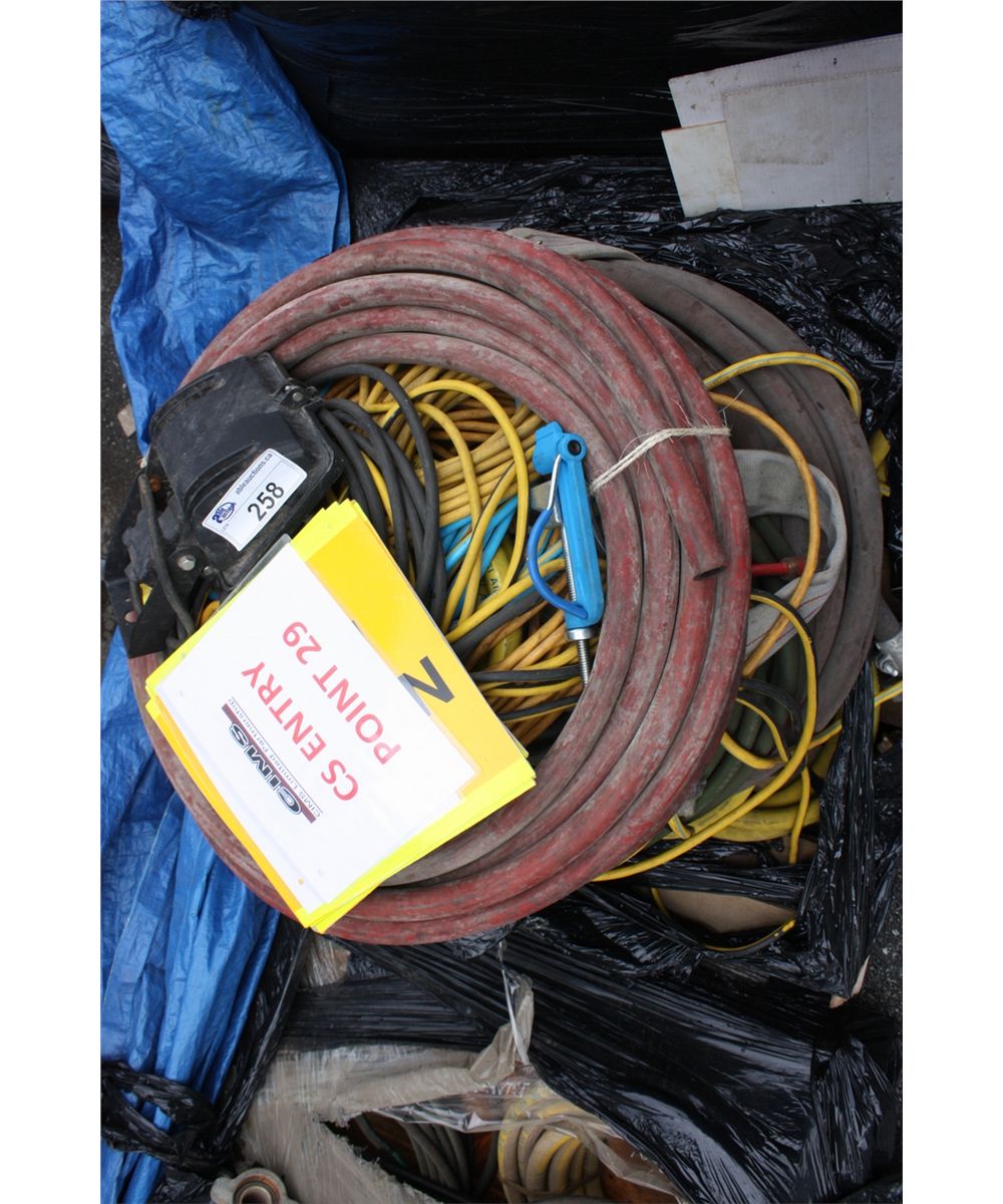 PALLET LOT OF MISC INDUSTRIAL ITEMS INCLUDING EXTENTION CORDS, HOSES, ETC