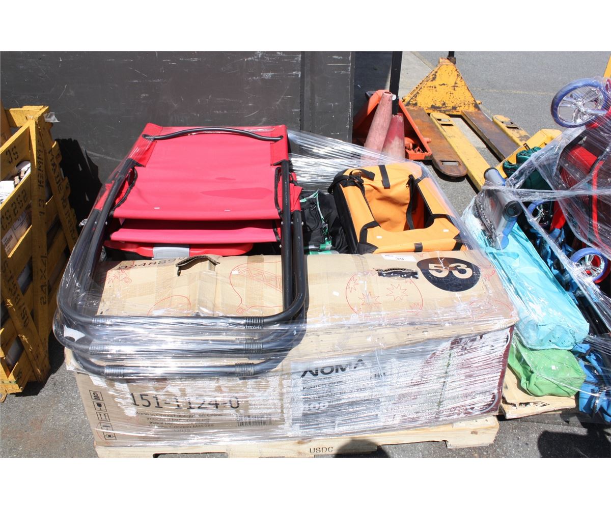 PALLET LOT OF MISC ITEMS; BEACH CHAIRS, PET CARRIER, DUFFLE BAGS, ETC