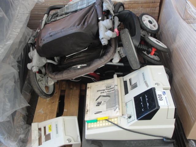 PALLET LOT OF MISC; SAMSUNG CASH REGISTER AND 2 BABY STROLLERS