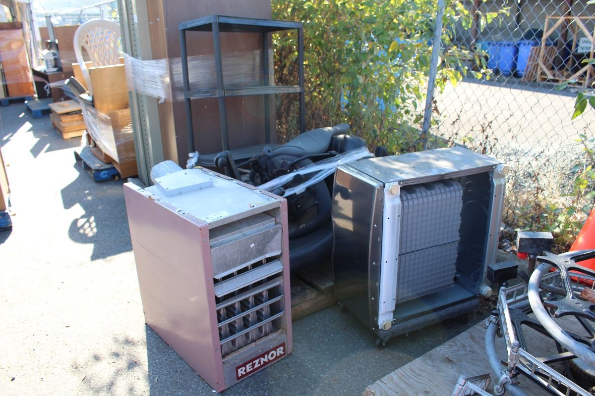 PALLET LOT OF OFFICE CHAIRS, SHELVING UNIT, HEATER AND LAUNDRY PEDESTAL