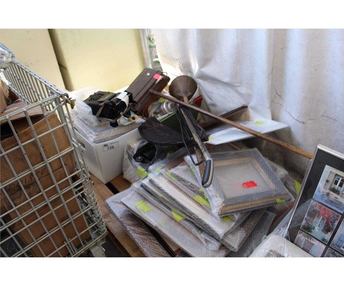 PALLET LOT OF PICTURE FRAMES, VINTAGE ADDING MACHINE, VACUUM, ETC