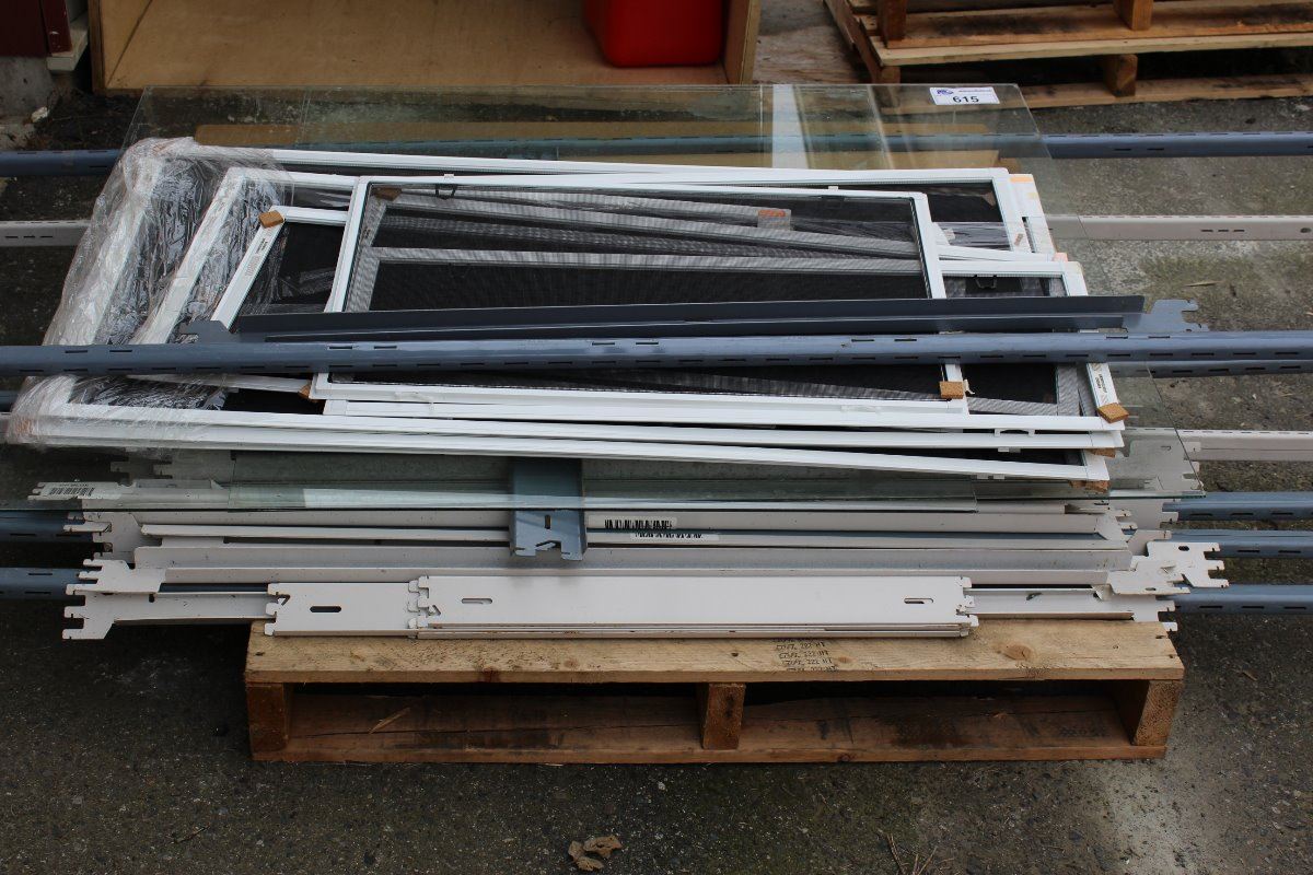 PALLET LOT OF SHELFING, WINDOW SCREENS ECT.