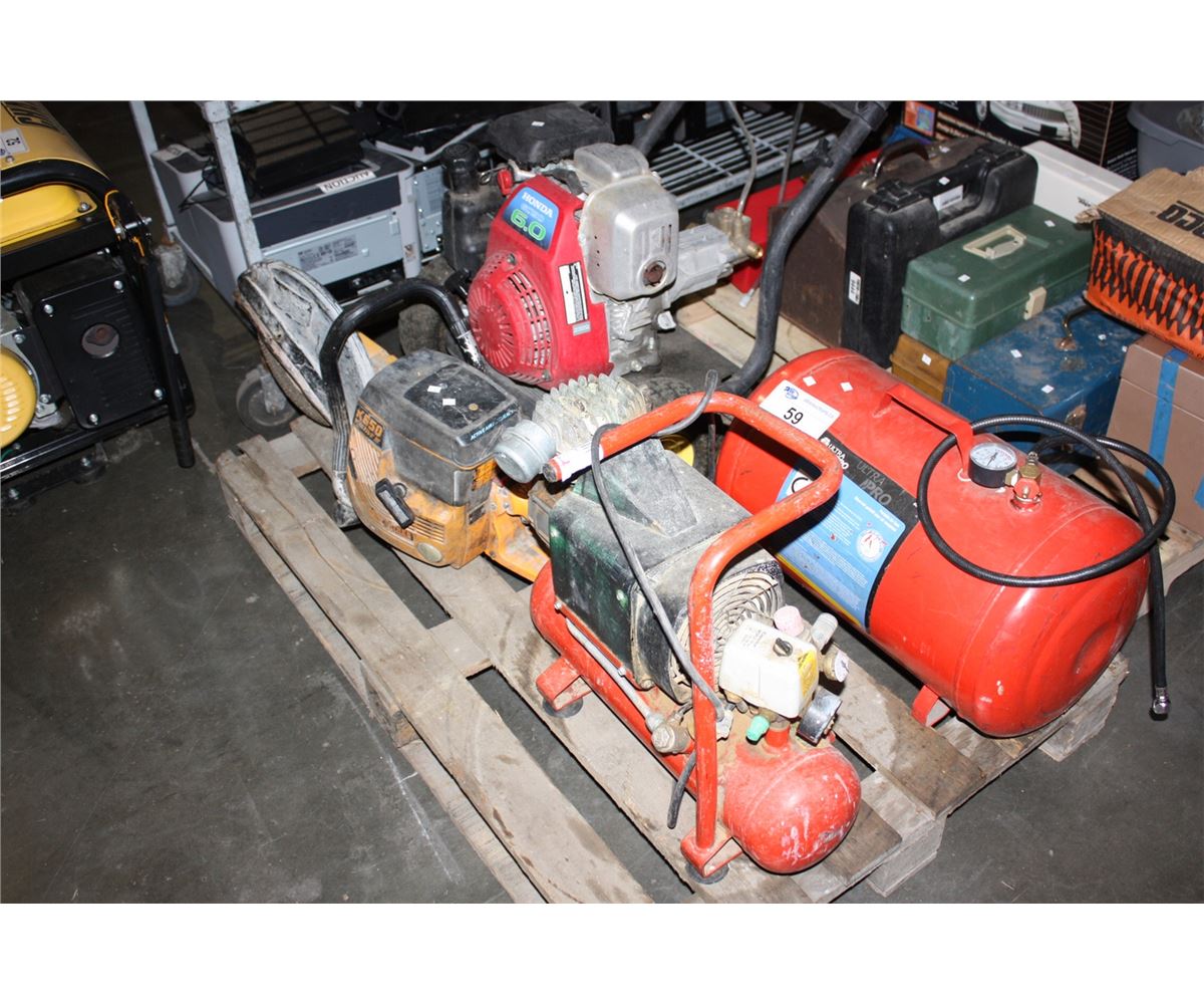 PALLET LOT OF TOOLS; KARCHER PRESSURE WASHER/ STEEL CONCRETE CUTTING SAW, AIR STORAGE TANK ETC