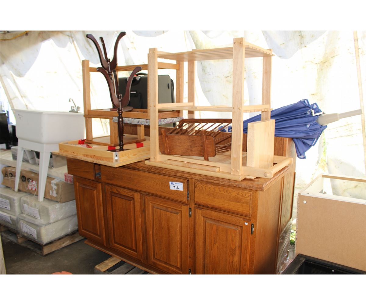 PALLET LOT OF WOODEN FURNITURE, SUITCASE, PATIO UMBRELLA, ETC