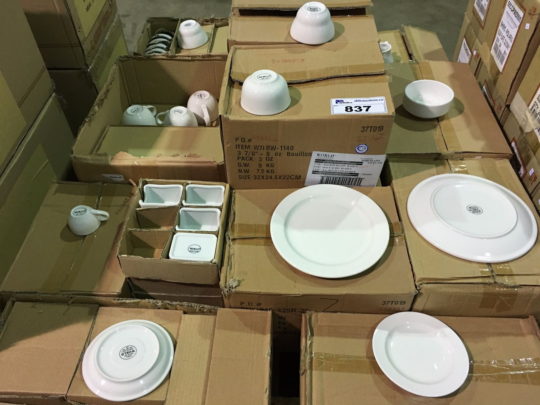 PALLET LOT OF WORLD BRAND ALL WHITE TABLE WARE: PLATES CUPS ETC.