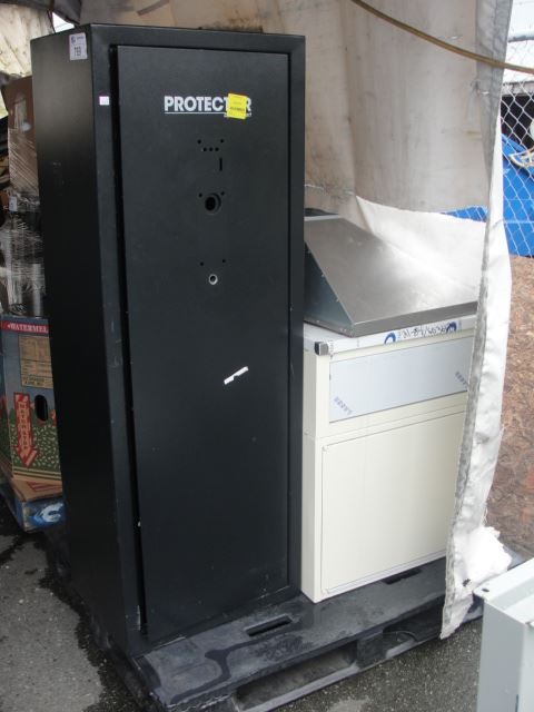 PALLET LOT WITH GUN SAFE (MISSING HANDLE), STAINLESS STEEL HOOD FAN AND METAL GARBAGE CAN