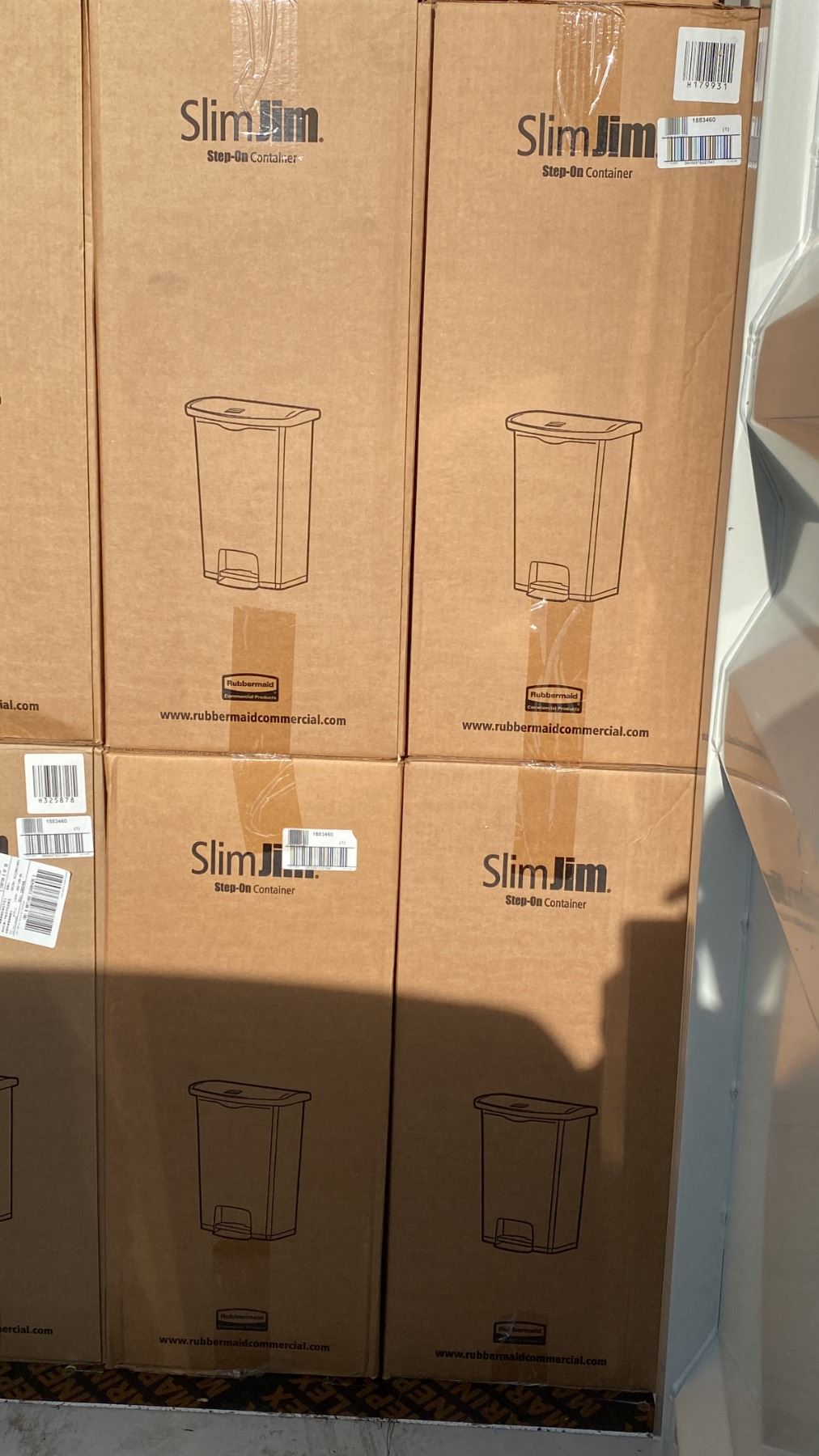 PALLET OF 12 RUBBERMAID COMMERCIAL SLIMJIM 68L STEP-ON WASTE RECEPTACLES *IN BOX*