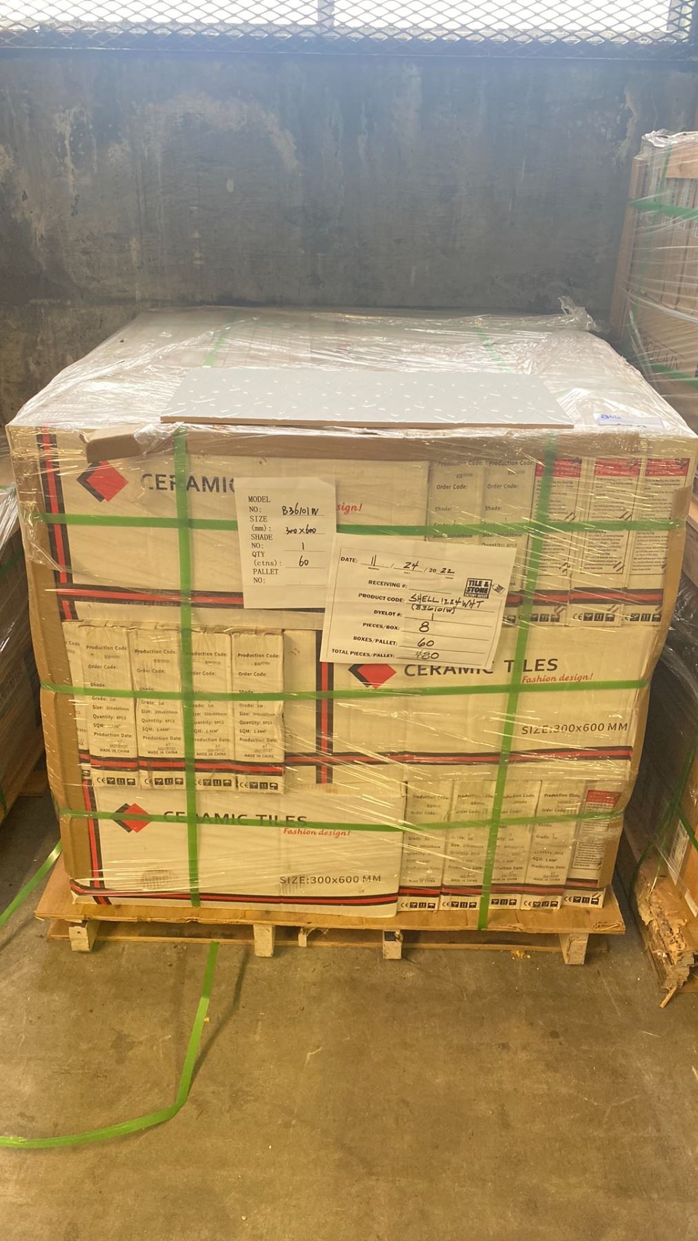 PALLET OF 12 X 24" PORCELAIN TILES IN SHELL1224WHT 16SQ.FT. PER BOX, APPROX 60 BOXES, APPROX 960SQ.FT. TOTAL