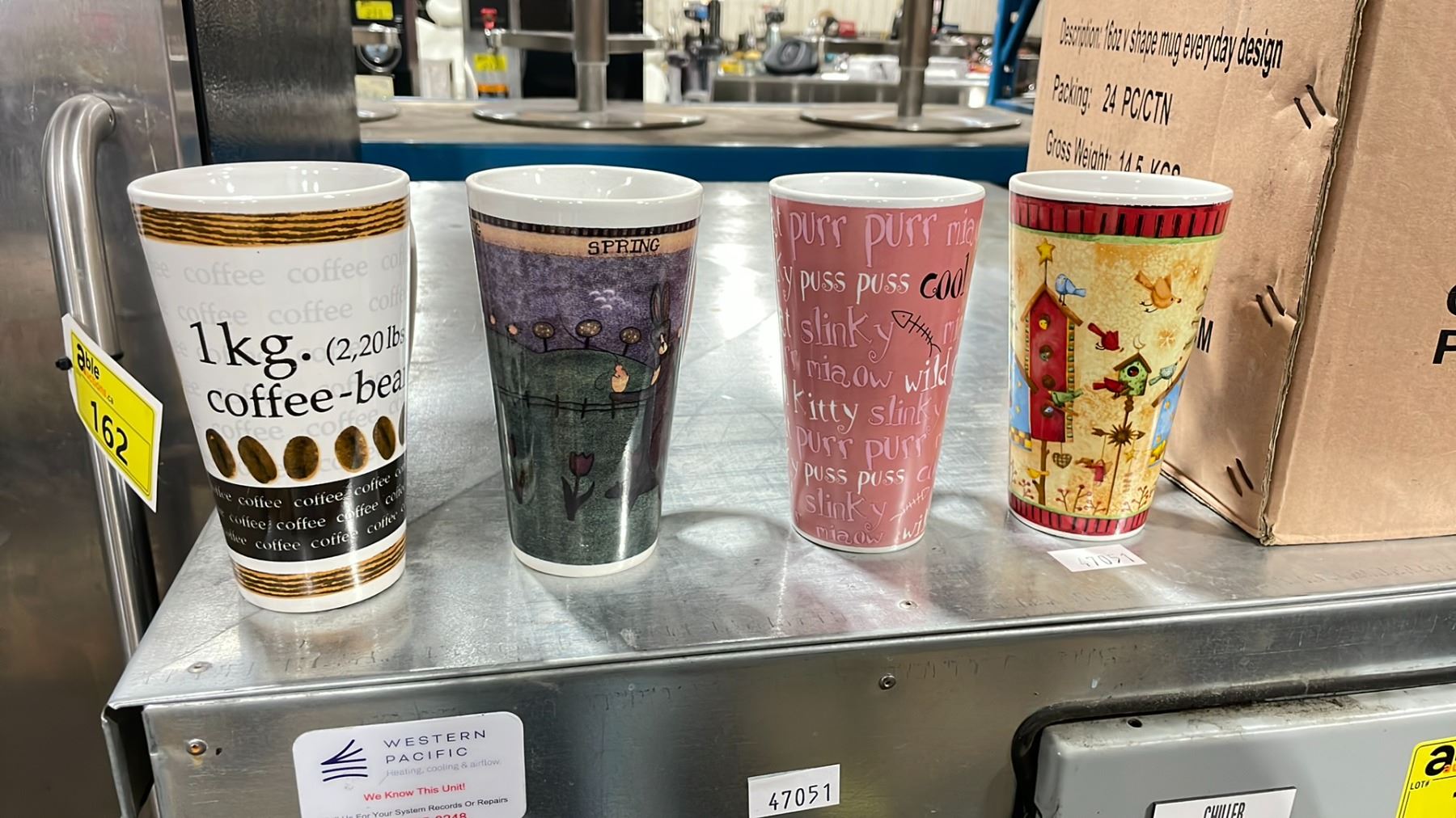 PALLET OF 16OZ V SHAPED EVERYDAY DESIGN MUGS APPROX 35 BOXES, 24 PCS PER BOX