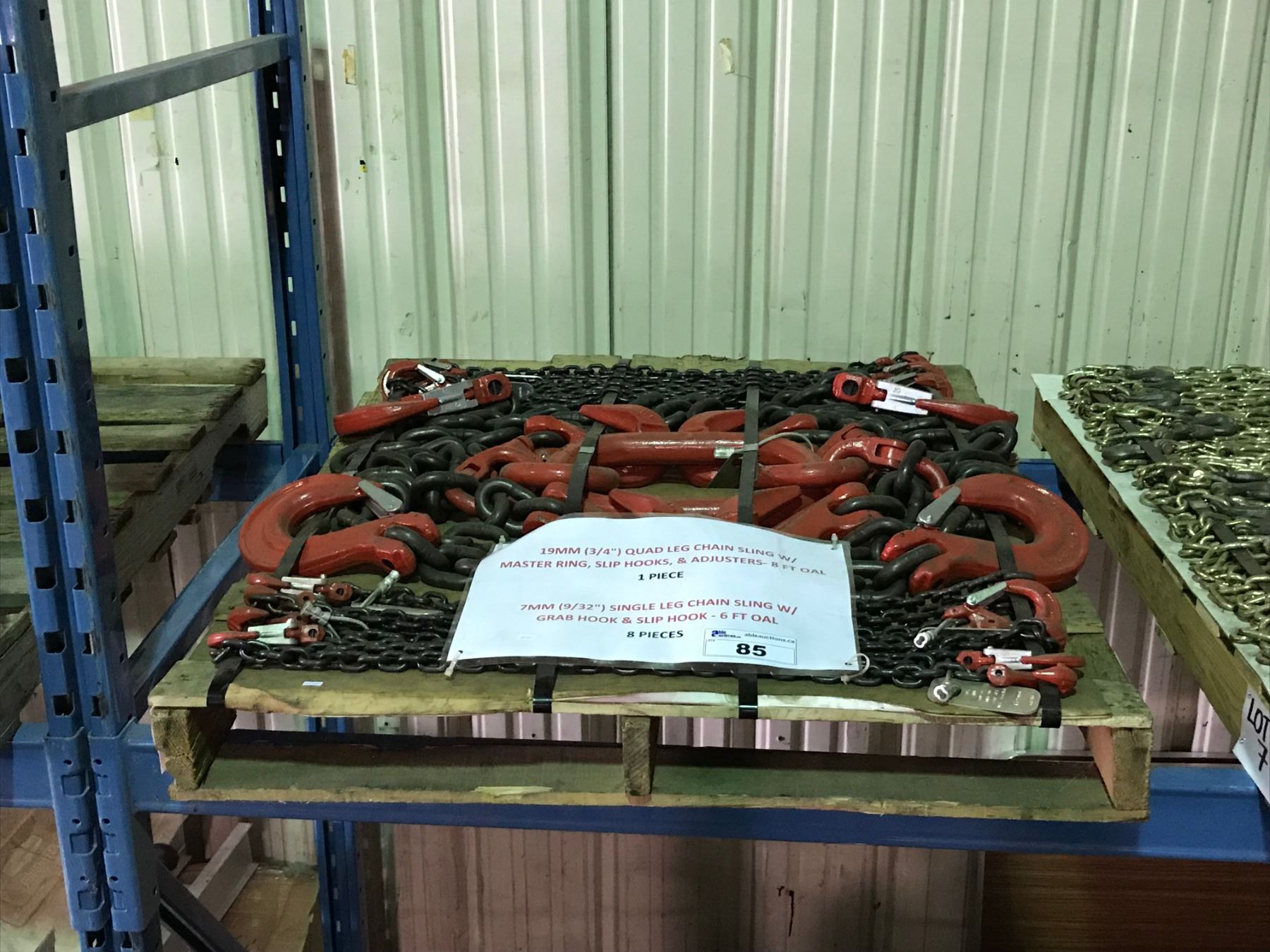 PALLET OF 19MM ( 3/4" ) QUAD LEG CHAIN SLING WITH MASTER RING, SLIP HOOKS, ADJUSTERS, 8' OAL & 8 LENGTHS OF 7MM ( 9/32" ) SINGLE LEG CHAIN SLINGS WITH GRAB HOOK, SLIP HOOK, 6' OAL