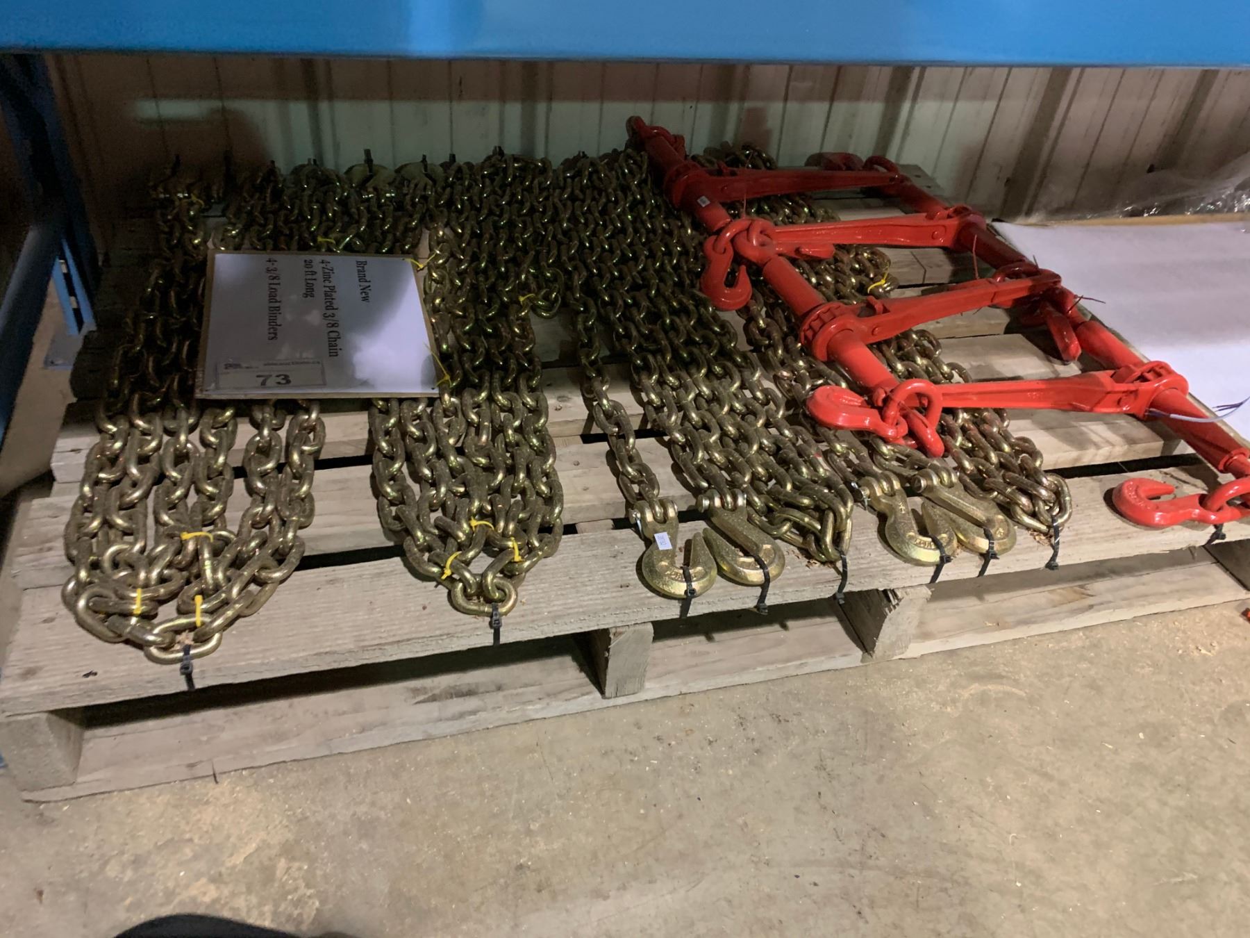 PALLET OF 4 - 20' ZINC PLATED 3/8 CHAIN & 4 - 3/8" LOAD BINDERS