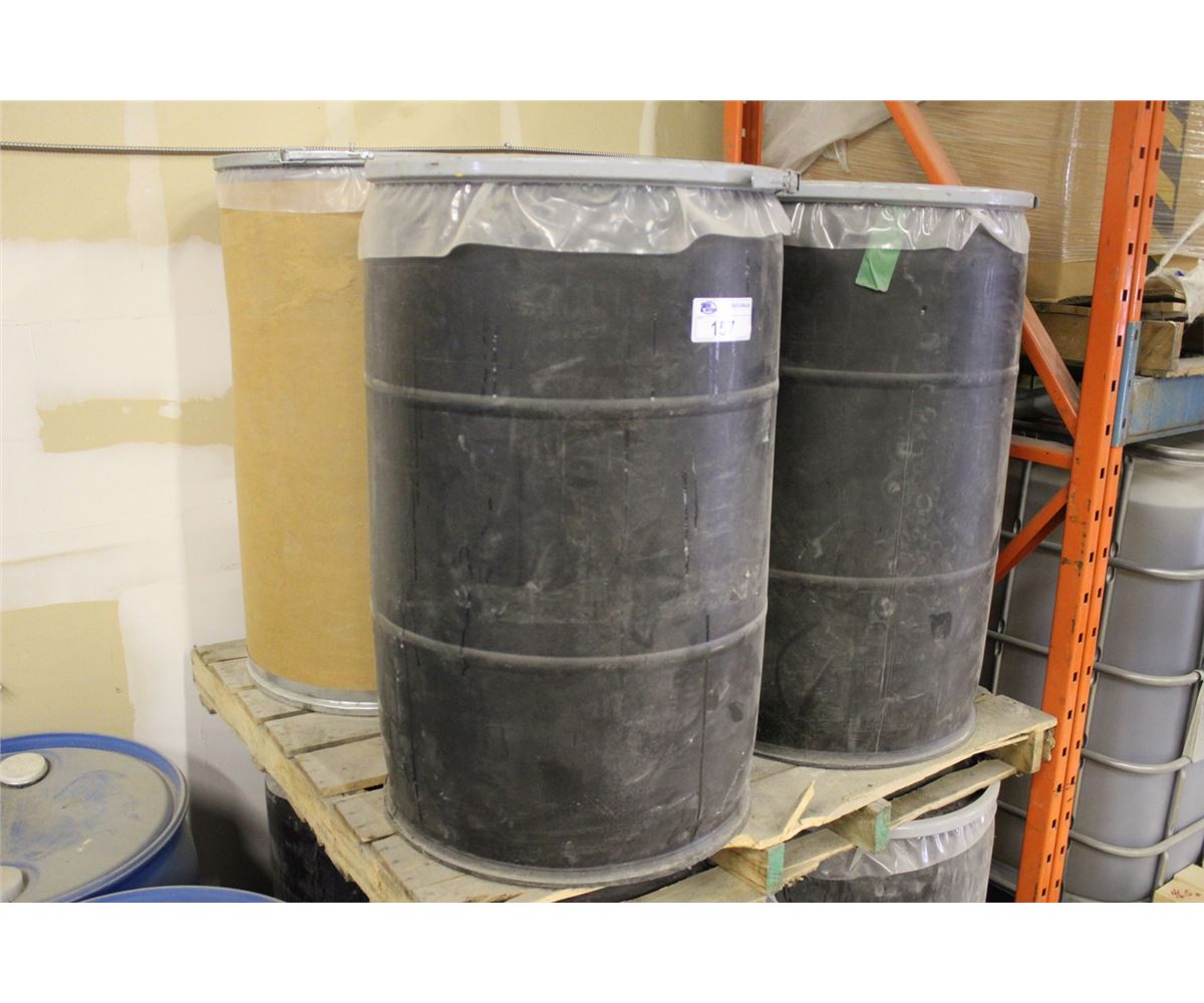 PALLET OF 4 BLACK STORAGE BARRELS WITH CONTENTS