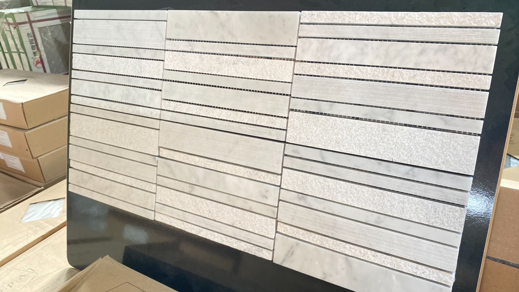PALLET OF 6 X 24" MIXED TEXTURE MOSAIC TILES IN BIANCO CARRARA 5SQ.FT. PER BOX APPROX 46 BOXES, APPROX 230SQ.FT. TOTAL