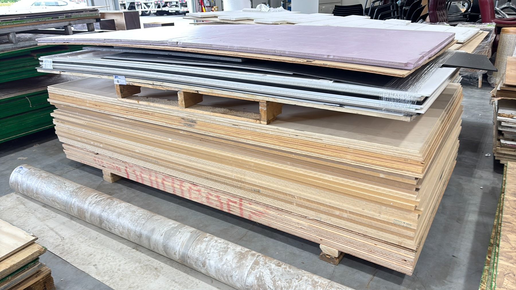 PALLET OF 8'L X 4'W PLYWOOD PANELS & PALLET OF ASSORTED SIZE FOAM PANELS & CORRUGATED PLASTIC PANELS