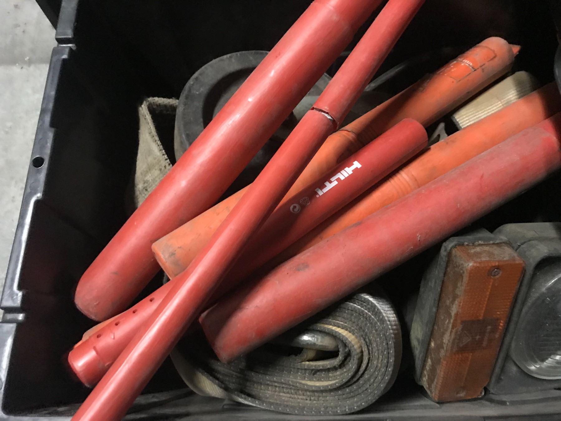 PALLET OF 8 LIDDED BLACK STORAGE BINS & CONTENTS-TOOLS, HARDWARE AND MISCELLANEOUS