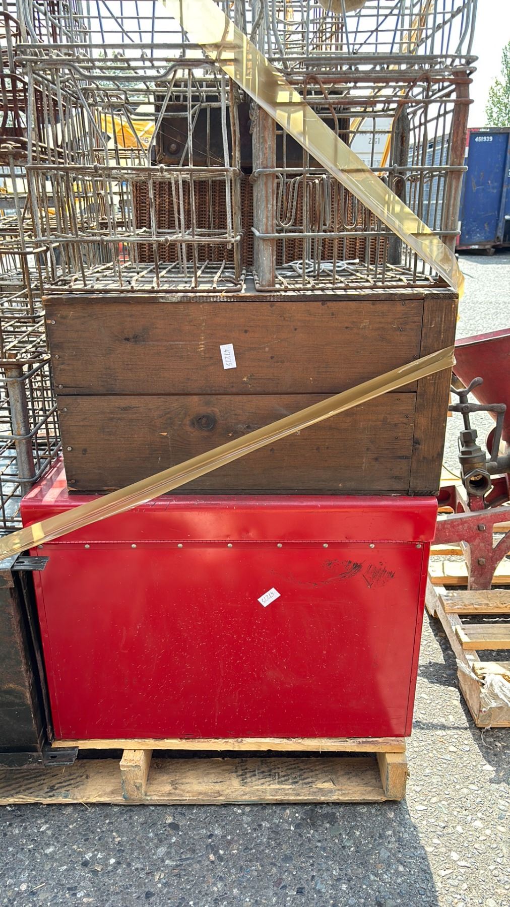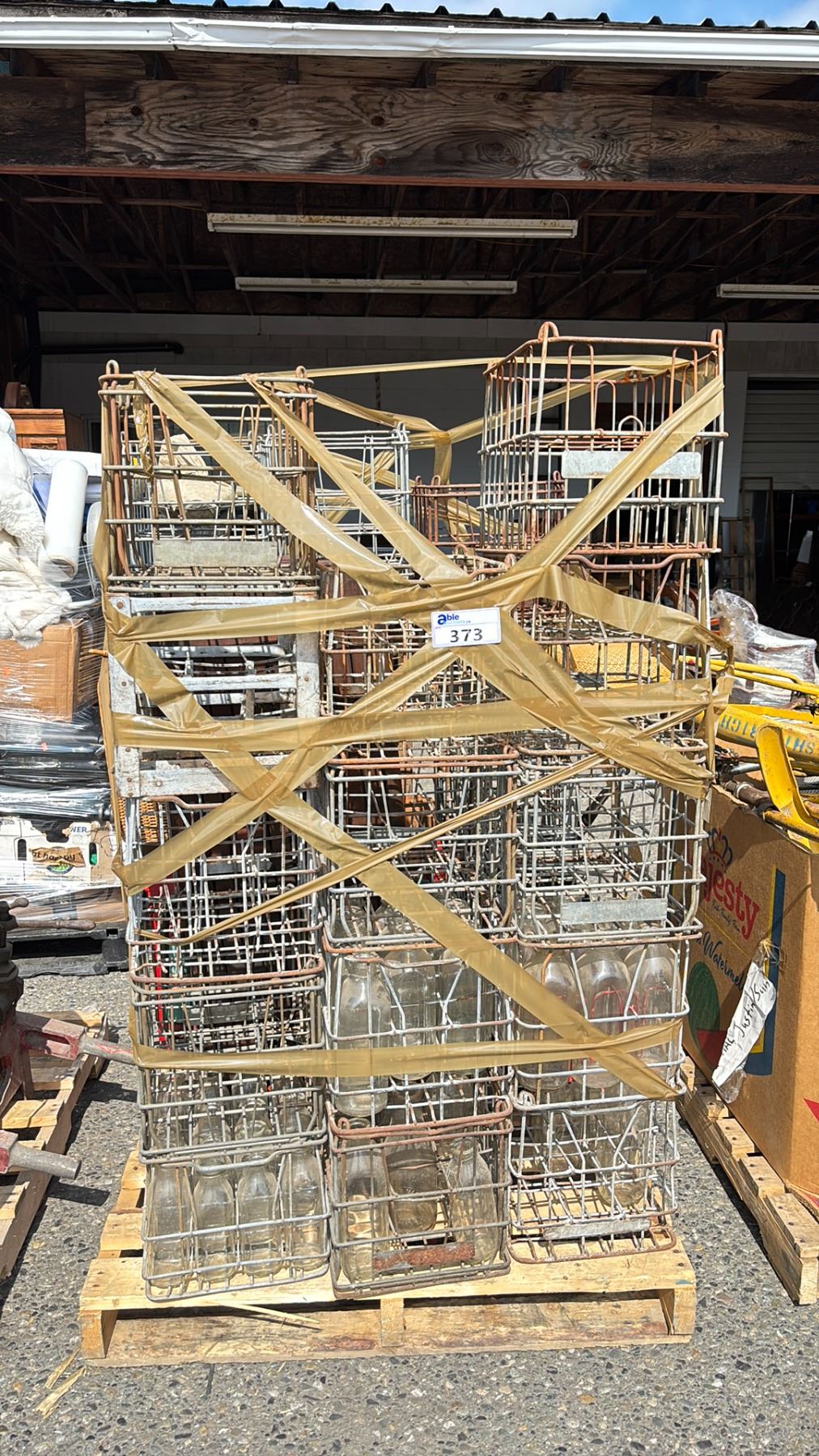 PALLET OF ANTIQUE GLASS RACKS, GLASS MILK JARS, WOODEN CRATES, METAL TOOL CHEST & MORE *MUST TAKE ALL ON PALLET*