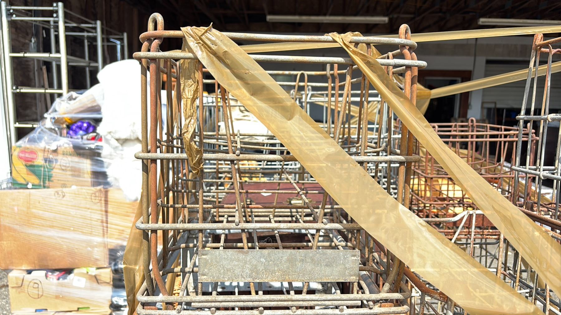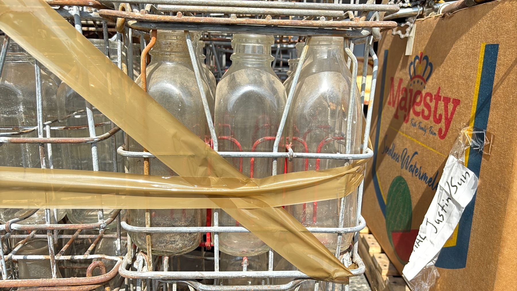 PALLET OF ANTIQUE GLASS RACKS, GLASS MILK JARS, WOODEN CRATES, METAL TOOL CHEST & MORE *MUST TAKE