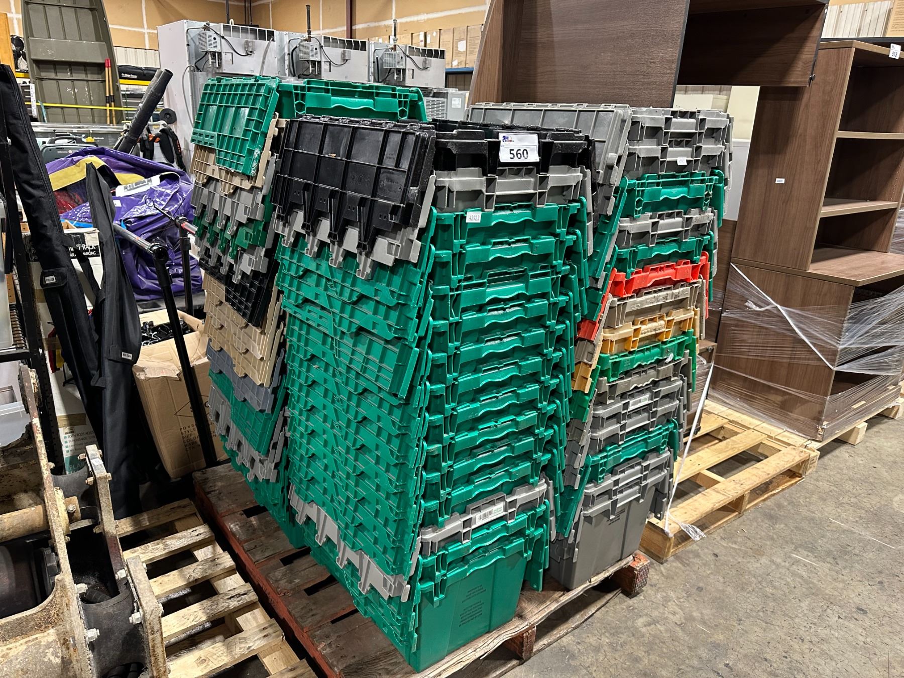 PALLET OF APPROXIMATELY 55 HEAVY DUTY PLASTIC STORAGE TOTES