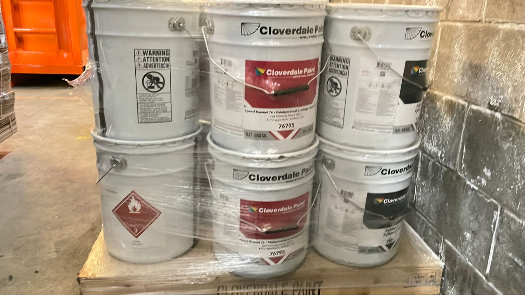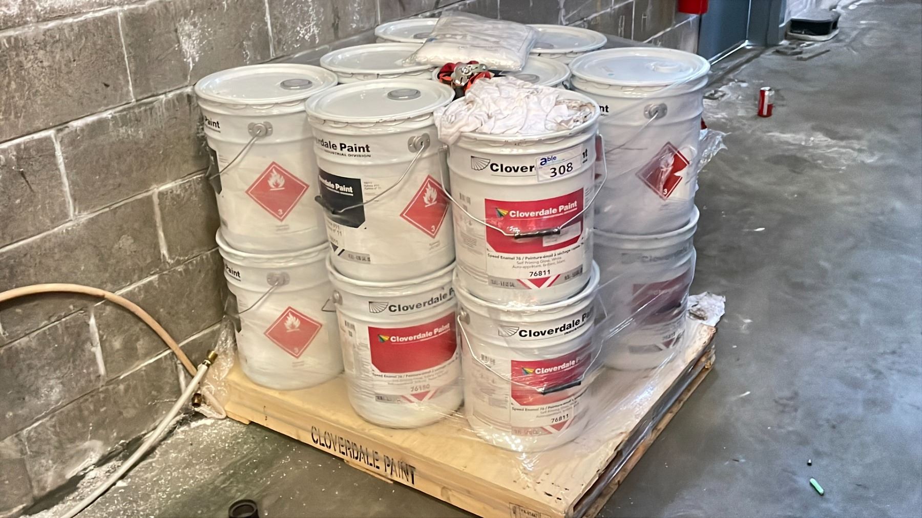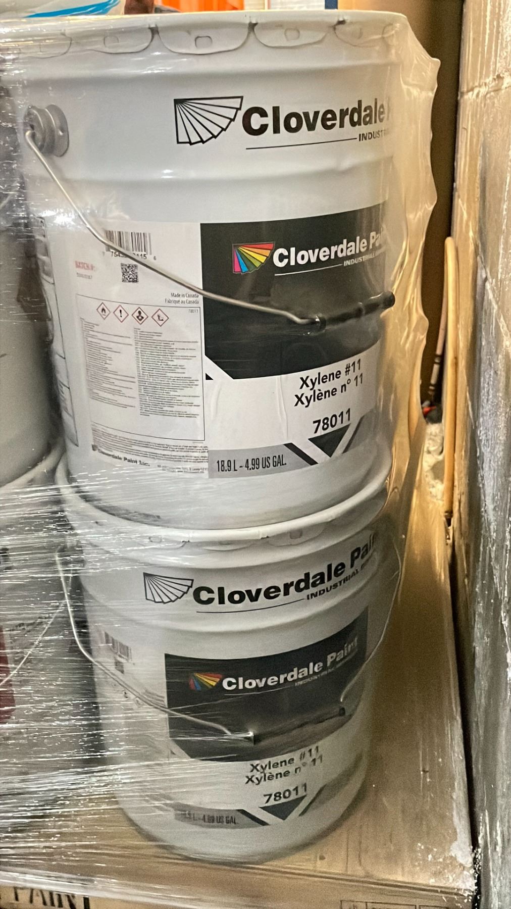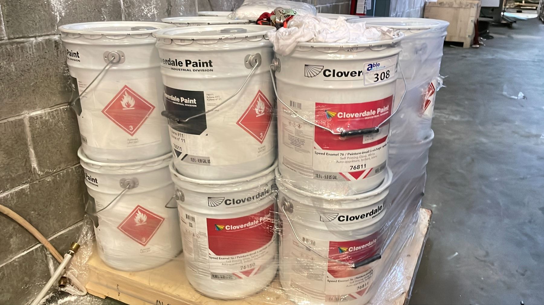 PALLET OF ASSORTED 18.9 LITRES PAILS OF CLOVER DALE PAINT AND XYLENE #11 APPROX 16 PAILS