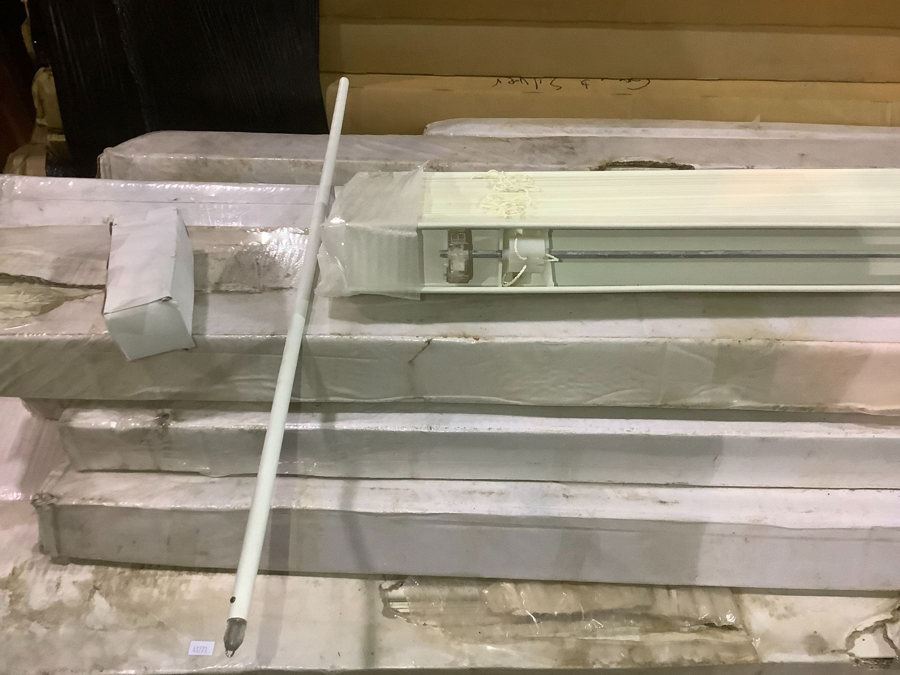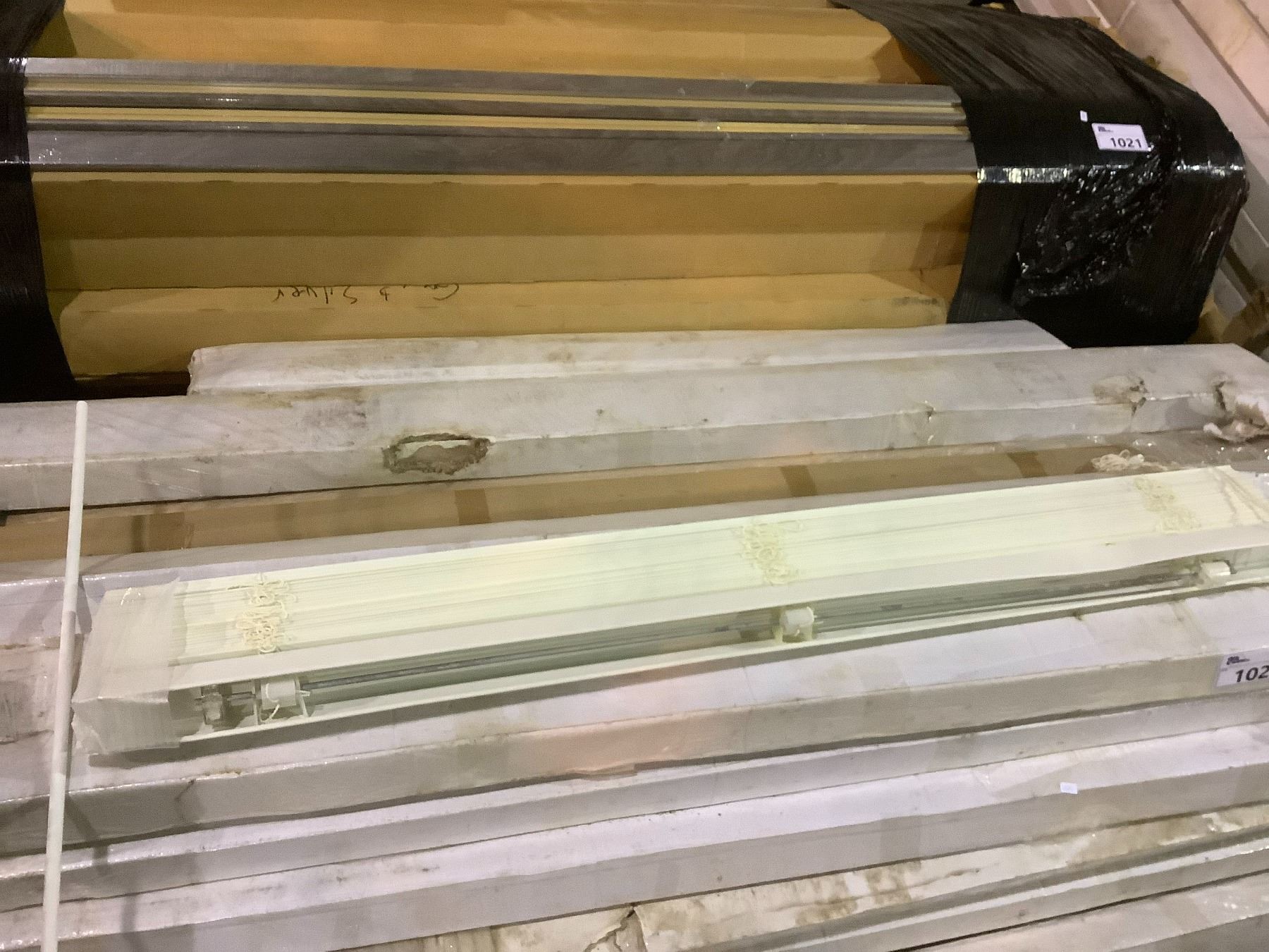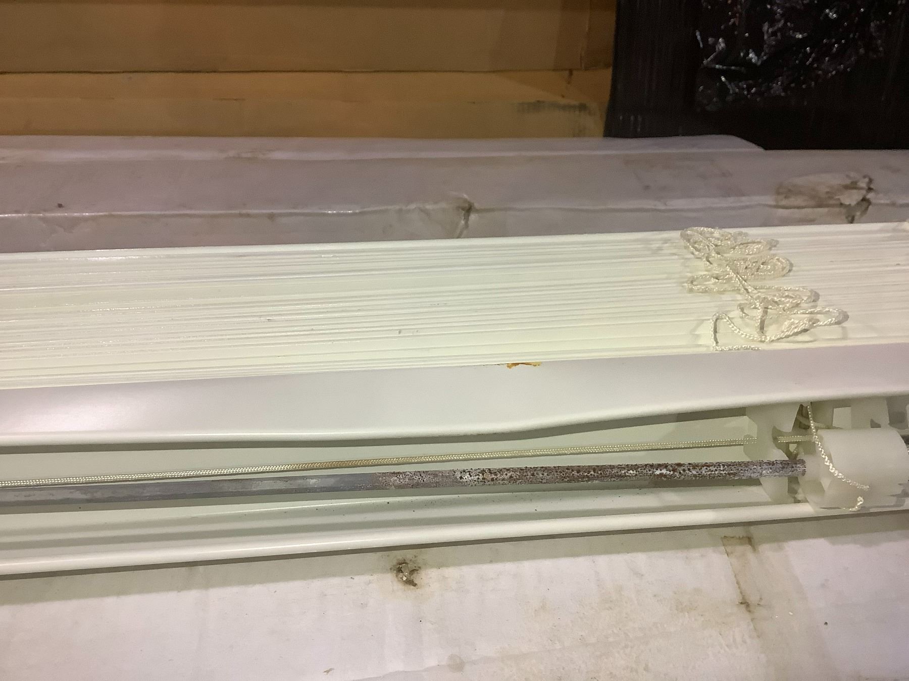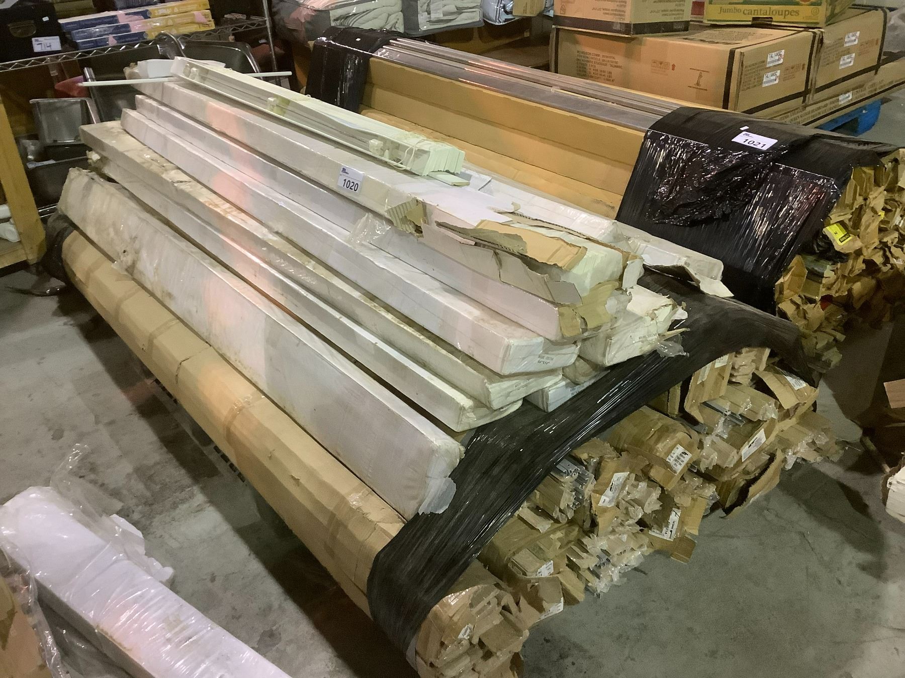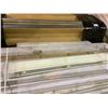 PALLET OF ASSORTED 94" BASEBOARD, AND TRANSITIONS, ASSORTED COLORS, AND BLINDS