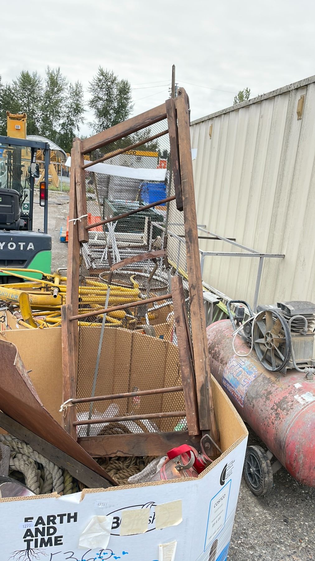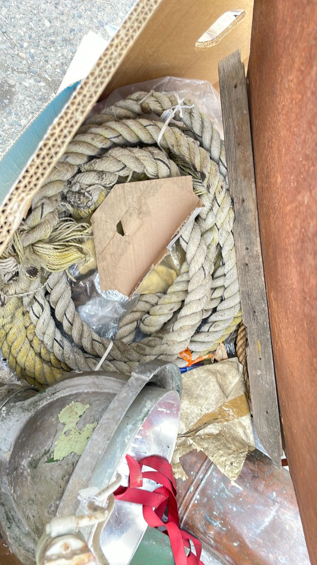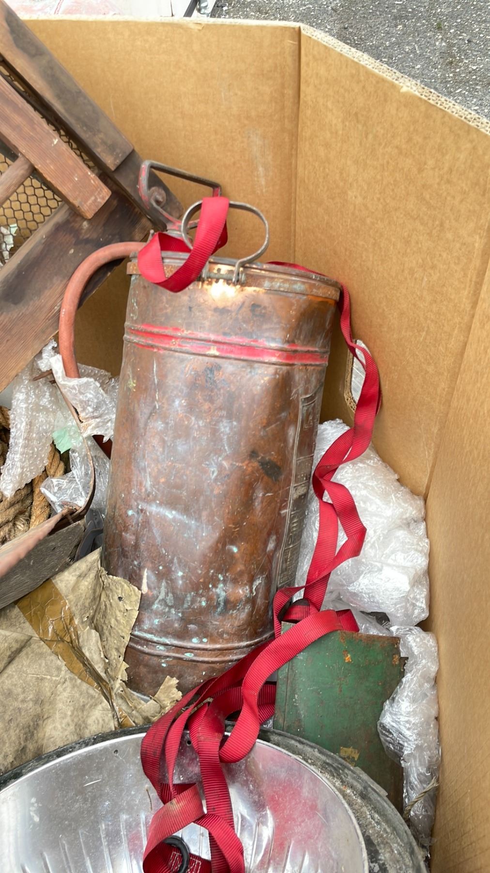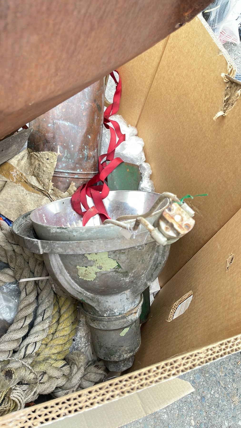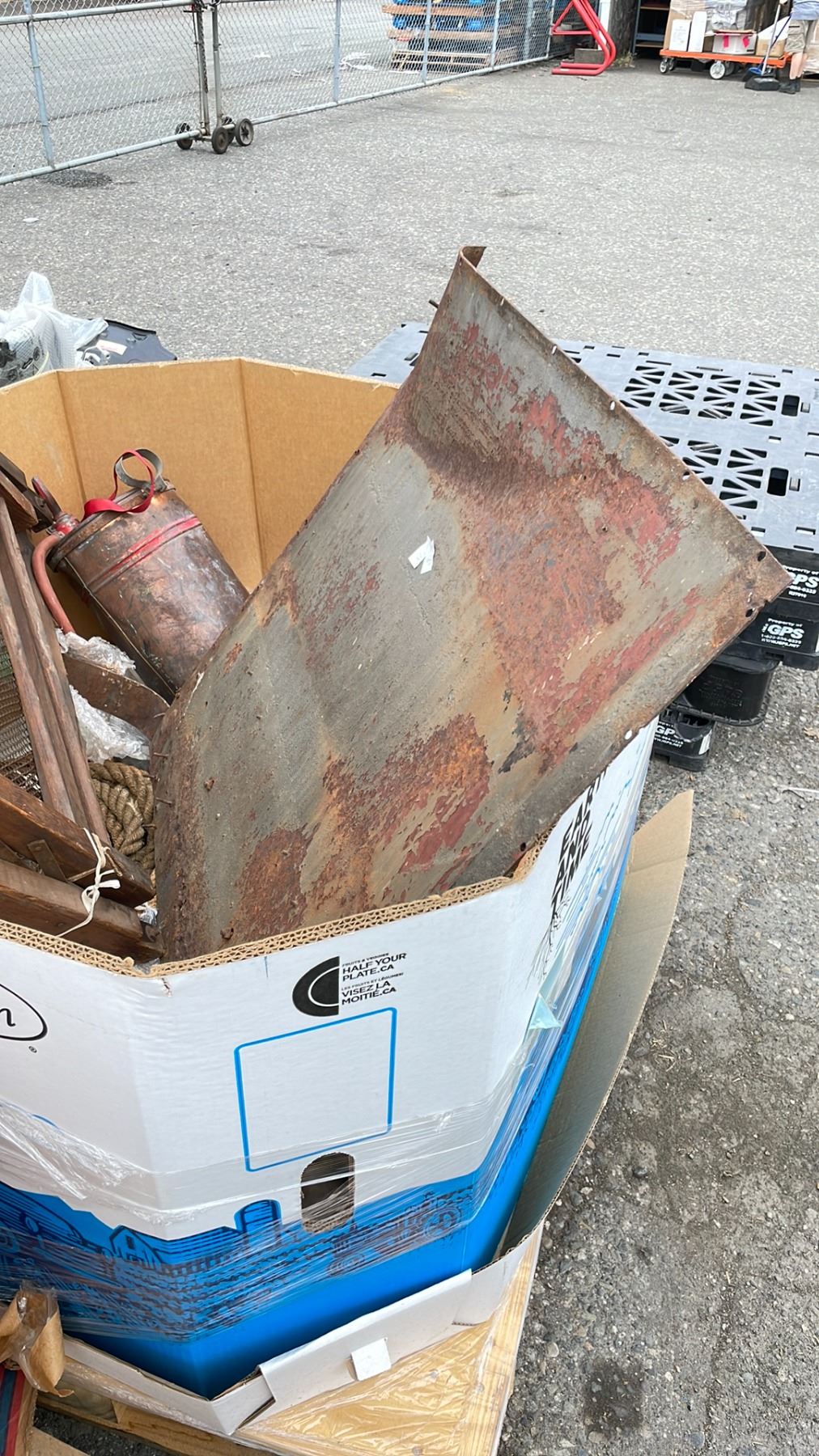 PALLET OF ASSORTED ANTIQUES INCLUDING; OVERHEAD LIGHT, FIRE EXTINGUISHER, MARINE ROPE & MORE