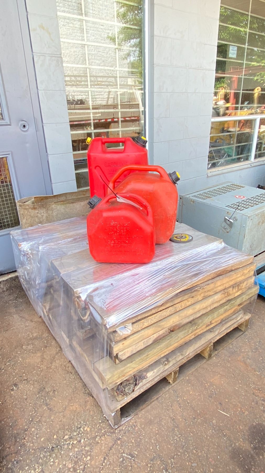 PALLET OF ASSORTED APPROX 3'L WOOD BOARDS & JERRY CANS