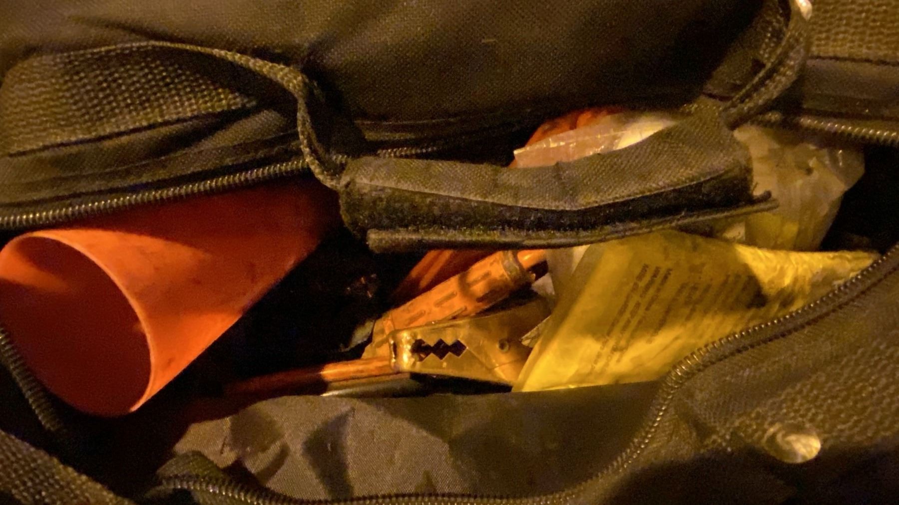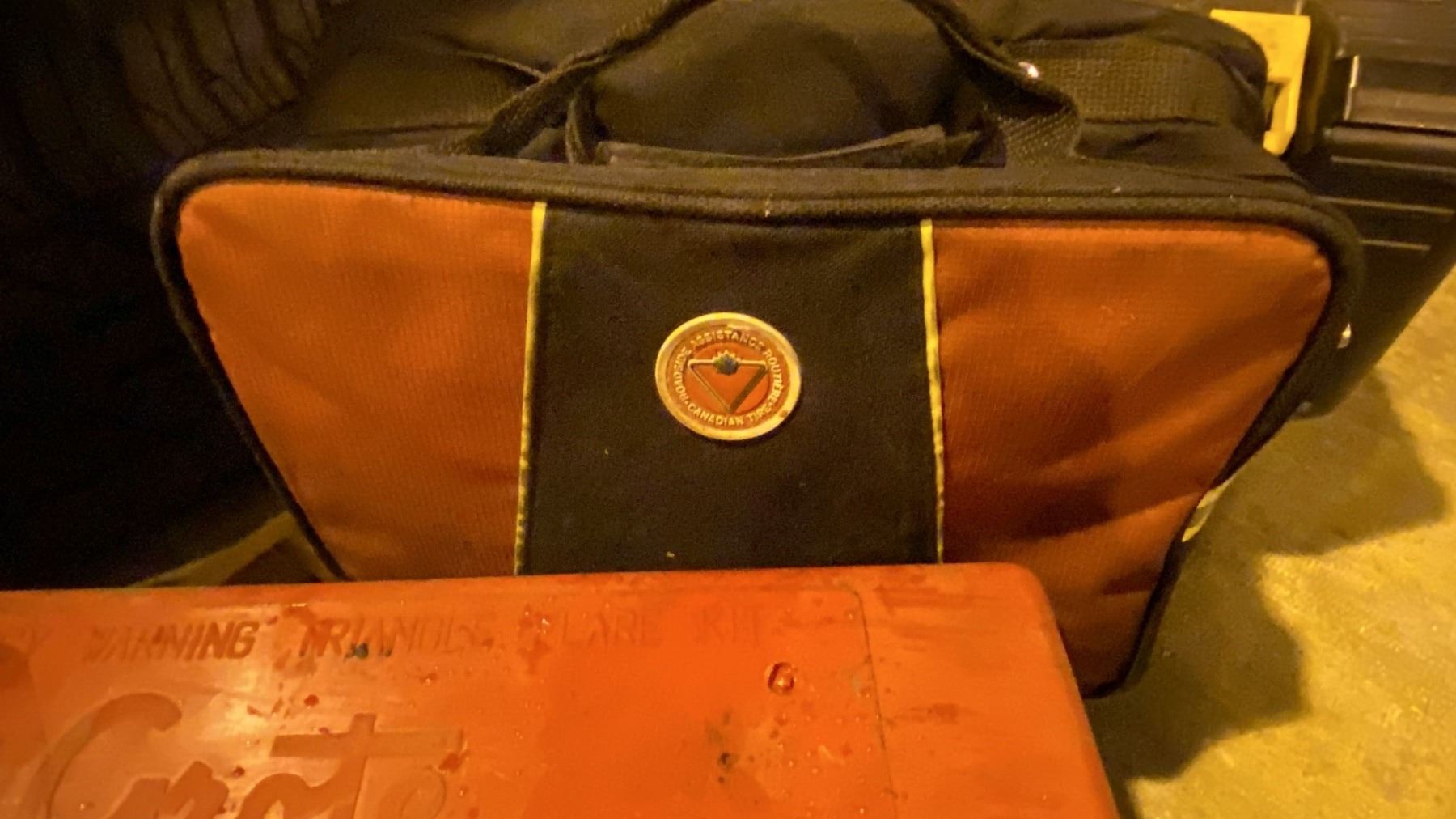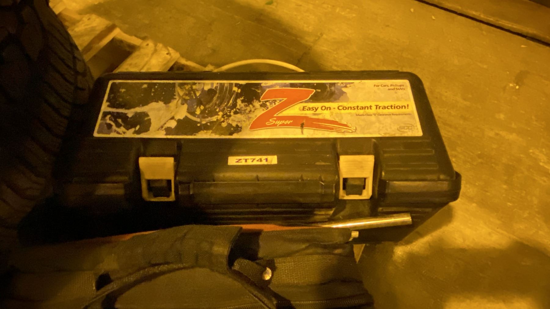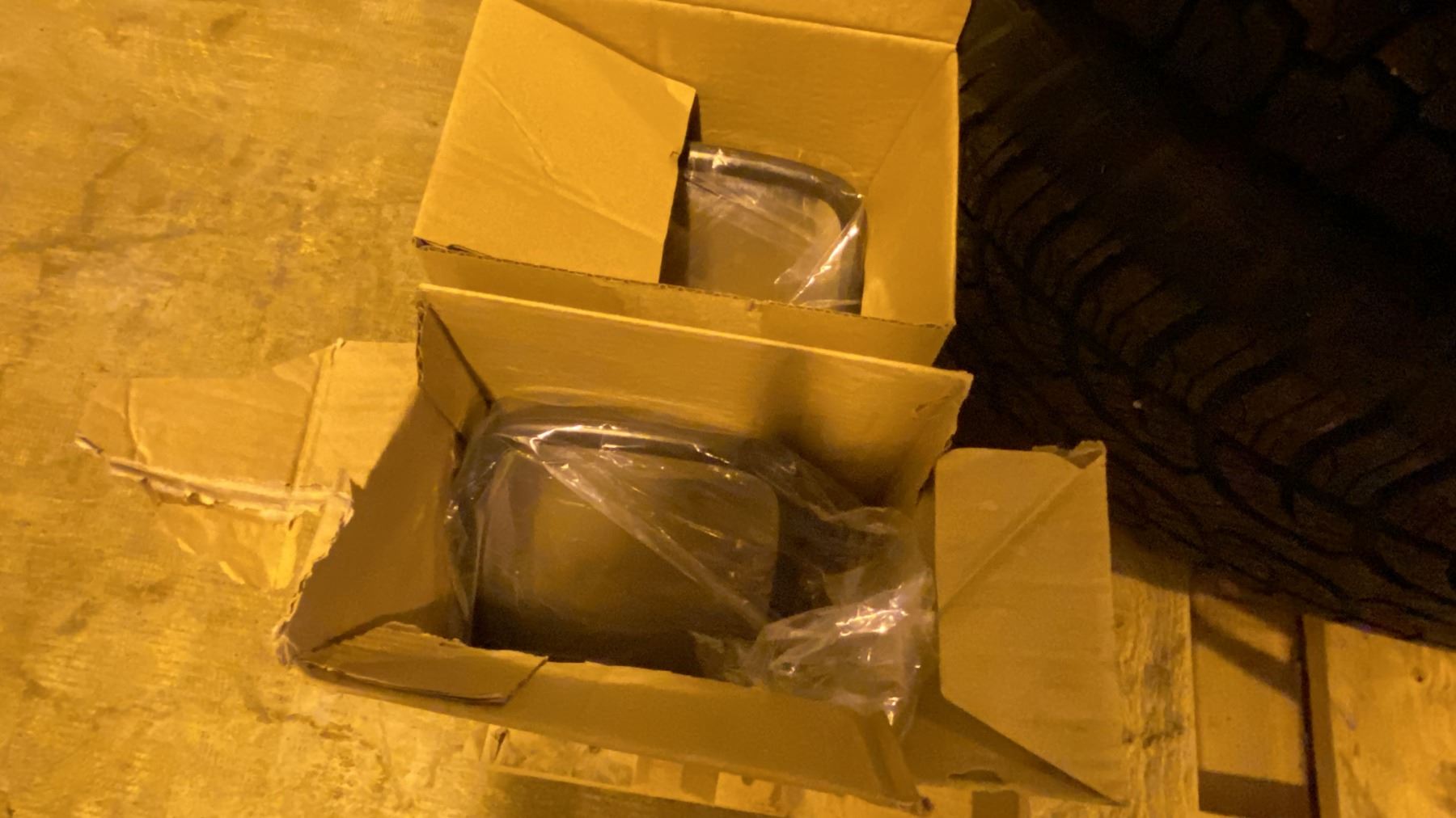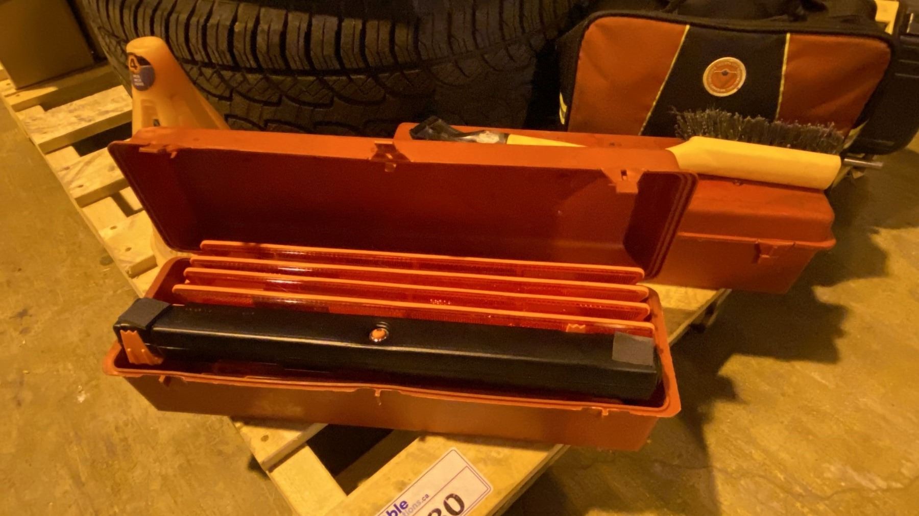 PALLET OF ASSORTED AUTO ITEMS - PAIR KELLY EDGE AT LT245/70R17 (M + S) TIRES, SINGLE JOYROAD SUV RX706 LT245/75R16 TIRE WITH RIM, ROAD EMERGENCY KITS, SNOW CHAINS, SIDE MIRRORS AND JUMPER CABLES